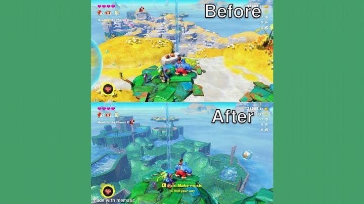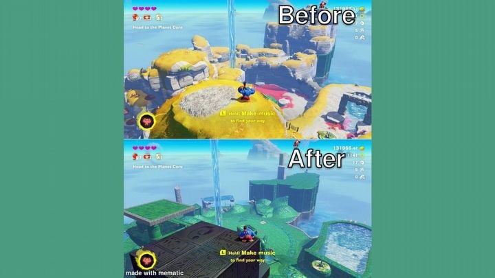 Ein umfassender Blick auf das gesamte Niveau vor und nach totaler Zerstörung.Donkey Kong Bananza, Entwickler: Nintendo