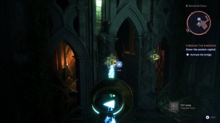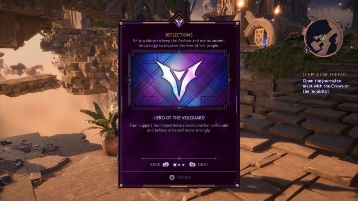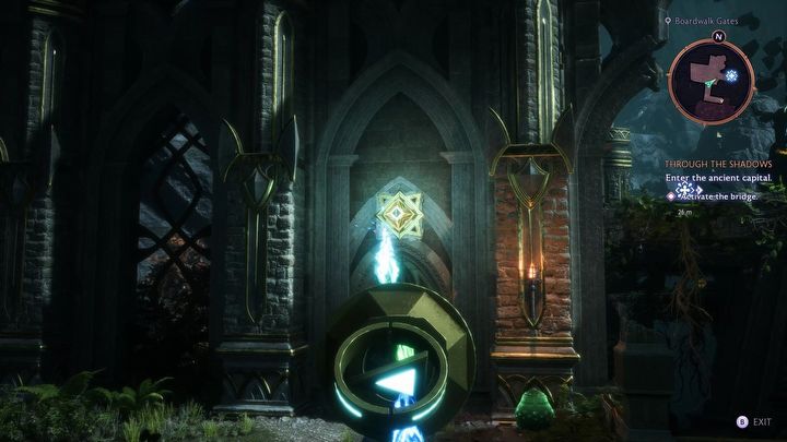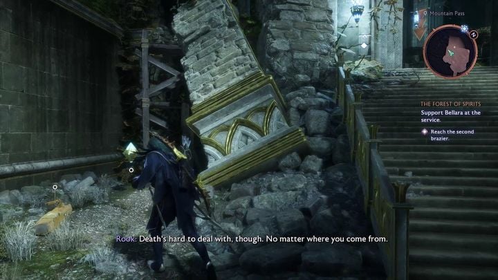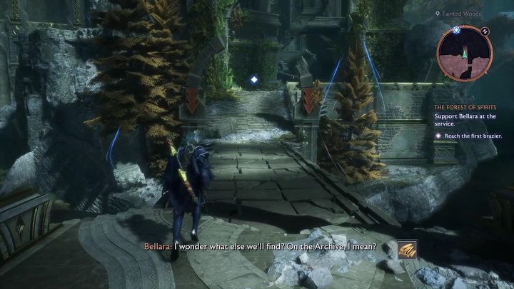 Die nächste Aufgabe ist sehr einfach. Sie müssen Bellara helfen, die Erinnerung ihres Bruders zu ehren. Folgen Sie dem linearen Pfad und befehlen Sie ihr, alle Lagerfeuer anzuzünden, denen Sie begegnen. Auf dem Weg müssen Sie den Weg weiter aufschließen, indem Sie den Kristall vom Boden der Treppe nehmen und ihn oben auf der Treppe in das Gerät einfügen. Sobald drei Lagerfeuer angezündet wurden, endet die Quest.