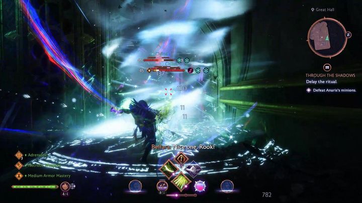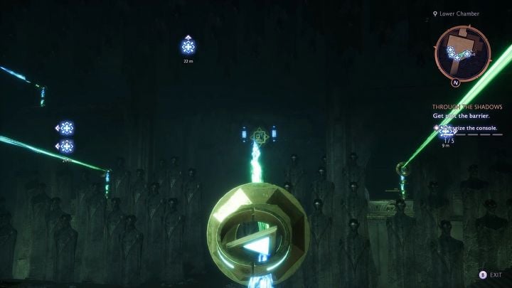 Im nächsten großen Raum müssen Sie und Bellara Anaris 'Ritual verzögern. Mehrere Wellen von Feinden erwarten Sie – Sie müssen die Verstärker zerstören, die in der Arena erscheinen. Die Arena ist groß und Sie haben viel Platz zum Manövrieren. Laufen Sie also vor Feinden weg, bis Sie alle Verstärker zerstören. Die Treppen, die in die oberen Stockwerke führen, befinden sich an der Nordwand des Raumes. Sobald Sie die Verstärker und Feinde ausgelöscht haben, aktivieren Sie das Gerät in der Nähe der blockierten Tür, um die nächste Welle zu starten. Insgesamt müssen Sie drei Wellen von Feinden besiegen.