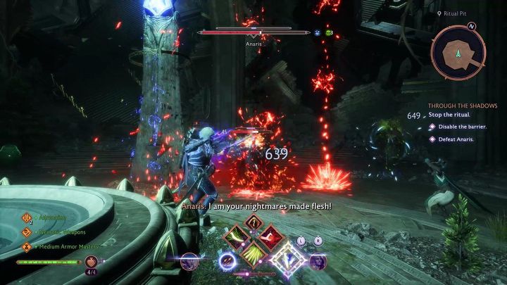 Im nächsten Raum werden Sie gegen Anaris kämpfen. Er ist von einem Schild umgeben, den Sie normal nicht zerstören können. Befreien Sie sich von allen Verstärkern, die auf den Rücken der Säulen hängen, um die Barriere zu zerstören. Sie können jetzt Anaris verletzen – er ist kein sehr gefährlicher Feind. Achten Sie einfach auf seine Region Magie, die er gerne geradeaus schießt (rote Kreise auf dem Boden). Wenn er in die Mitte der Arena zurückkehrt und sich erneut schützt, zerstören Sie alle Verstärker erneut. Anaris zu besiegen wird die Quest abschließen.