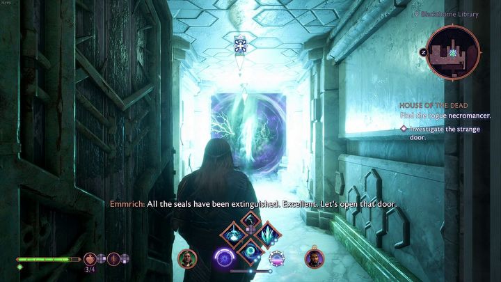 Warten Sie, bis Emmrich die Ritualstelle enttäuscht und dann zur nächsten verschlossenen Tür gehen. Es befindet sich im ersten Stock, rechts vom Eingang zum Grundstück (Raum mit einem großen Kronleuchter).