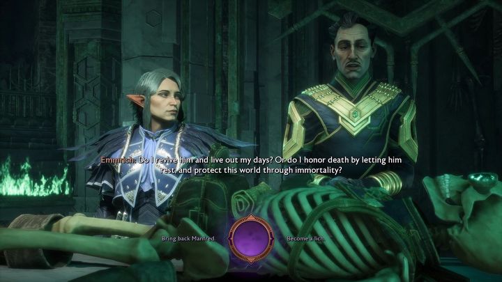 Nach dem Kampf müssen Sie eine endgültige Entscheidung treffen. Emmrich kann Manfreds Opfer ehren und ein Lich werden oder seinen Traum opfern, Manfred wieder zum Leben zu erwecken.