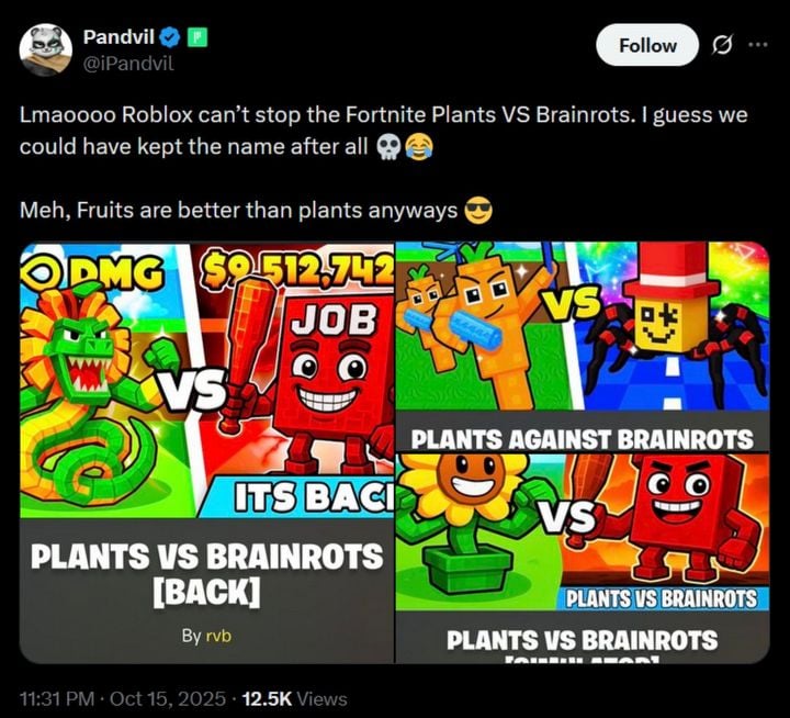 Am 15. Oktober, dem Tag, an dem seine Plants vs Brainrots auf Fortnite veröffentlicht wurden, veröffentlichte Pandvil einen ziemlich spöttischen Beitrag über die ganze Situation mit der Roblox-Version.