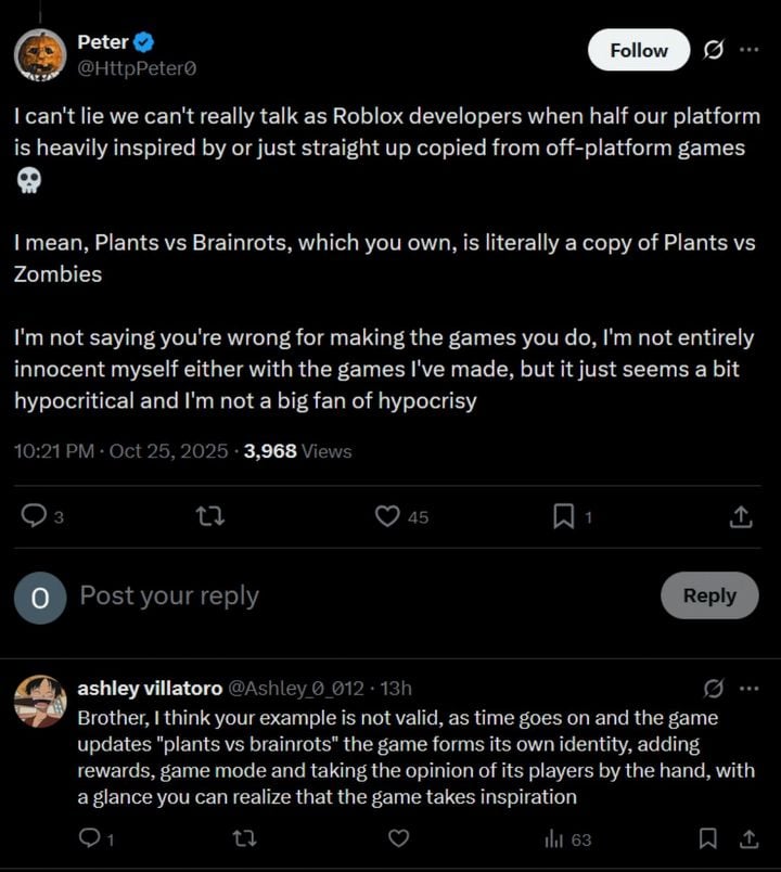 „Plants vs. Brainrots“ von Roblox ist natürlich vom Hit „Plants vs. Zombies“ aus dem Jahr 2009 inspiriert, einem äußerst beliebten Tower-Defense-Spiel, das unzählige Fortsetzungen, Spin-offs und Adaptionen hervorbrachte. Man könnte sagen, dass „Plants vs Brainrots“ von Jandel eine weitere Version dieser Formel ist. Unter Jandels Beitrag gibt es bereits eine Diskussion darüber, ob sein Spiel als neue Adaption mit eigener Identität oder nur als Plants vs. Zombies-Kopie gilt.