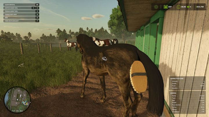 Unabhängig davon, ob das Pferd im Farmhaus steht oder ob Sie es derzeit fahren, wird das Tier schmutzig (obwohl es im zweiten Szenario merklich schneller passiert). Dies wird durch die Sauberkeitsstatus angezeigt. Daher müssen Sie nach dem Training das Tier reinigen. Zu diesem Zweck müssen Sie einen Pinsel verwenden, den Sie im Bereich der Handwerkzeuge kaufen werden. Um das Pferd zu reinigen, müssen Sie das Werkzeug in der Hand ändern, sich dem Tier nähern und darauf klicken, bis der Indikator voll ist.