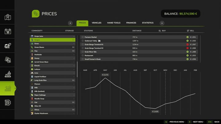 Wenn Sie mit dem periodischen Kalender eingeschaltet spielen, können Trauben von März bis Mai gepflanzt und im September und Oktober geerntet werden. Oliven können von März bis Juni gepflanzt und erst im Oktober geerntet werden. Beide Kulturen teilen einen ähnlichen Preis: rund 2.150 Euro pro Tonne, aber die Trauben werden am besten im Mai verkauft, während Oliven – im Juni.