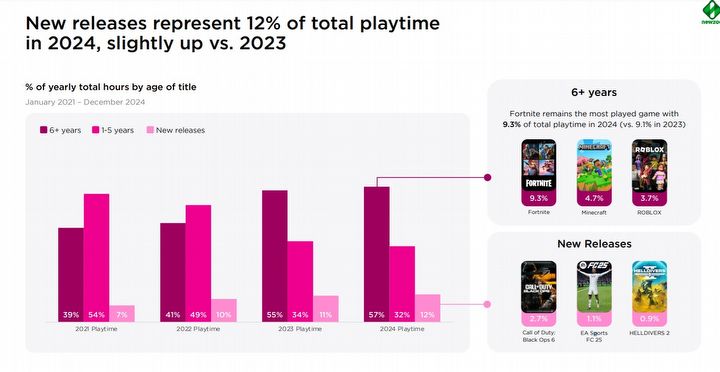 Die Dauer für das Spielen jedes Titels im Jahr 2024 ist ebenfalls interessant. Fans bevorzugen definitiv ältere Titel, die vor mindestens 6 Jahren veröffentlicht wurden – sie machen 57% aller Spiele aus, für die wir unsere Freizeit verbracht haben. Dazu gehören unter anderem Fortnite (9,3%), Minecraft (4,7%) und Roblox (3,7%).