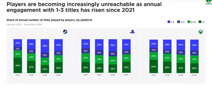 Titel, die seit 1 bis 5 Jahren auf dem Markt sind, machen 32%aus. Die neuesten Veröffentlichungen wie EA Sports FC 25 oder Call of Duty: Black Ops 6 machen jedoch nur 12%aus. Alle oben genannten Zahlen bezüglich der Spielzeit sind den von Newzoo geteilten Ergebnissen von 2023 ziemlich ähnlich.