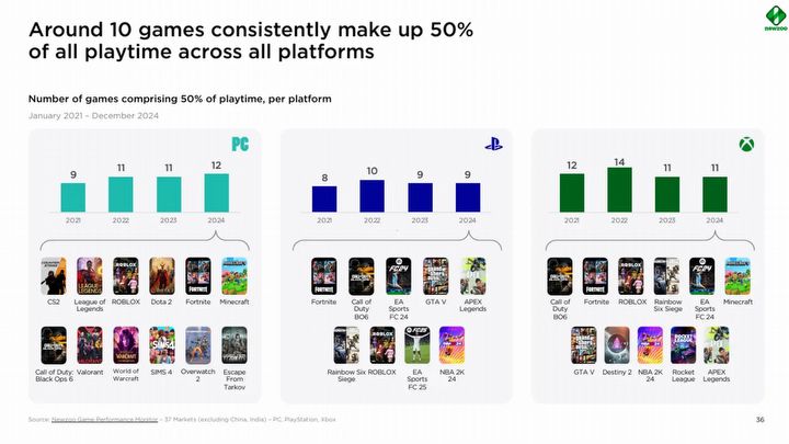 Es bleibt unverändert, dass die zuvor erwähnte EA Sports FC und Call of Duty -Serie häufiger auf Konsolen gespielt werden. Im Folgenden finden Sie eine Grafik mit den Spielen, die im Jahr 2024 auf einer bestimmten Plattform am beliebtesten waren. Was interessant ist, im Vergleich zu 2023 ist die Playstation -Konsolen im Vergleich zu 2023 erheblich um 21%gestiegen.