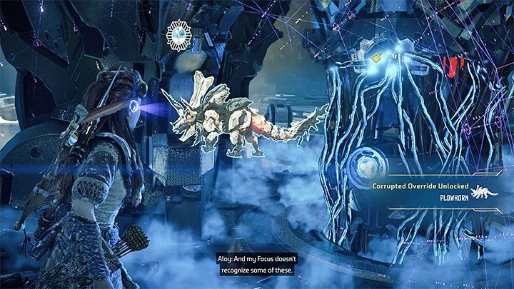 Sobald der Kampf beginnt, sollten Sie den Boss scannen und seine detaillierte Beschreibung im Maschinenkatalog durchlesen. Auf diese Weise lernen Sie die Schwächen des Bosses kennen – in dieser Phase des Spiels sollten Sie bereits Zugriff auf Säureschaden haben (Fernkampfwaffen und/oder Säurefallen).