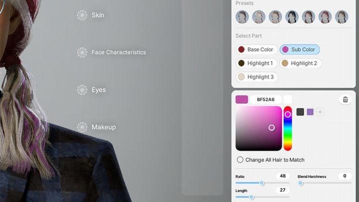 Und über Farben sprechen. Das Farbrad wird in dieser Bewertung immer wieder schwärmen. Sie können im Grunde alles anpassen – Haut, Augen, Make -up, Haare und sogar die Farben der Kleidung. In einigen Fällen können Sie Intensität, Transparenz oder wie die Farben mischen.