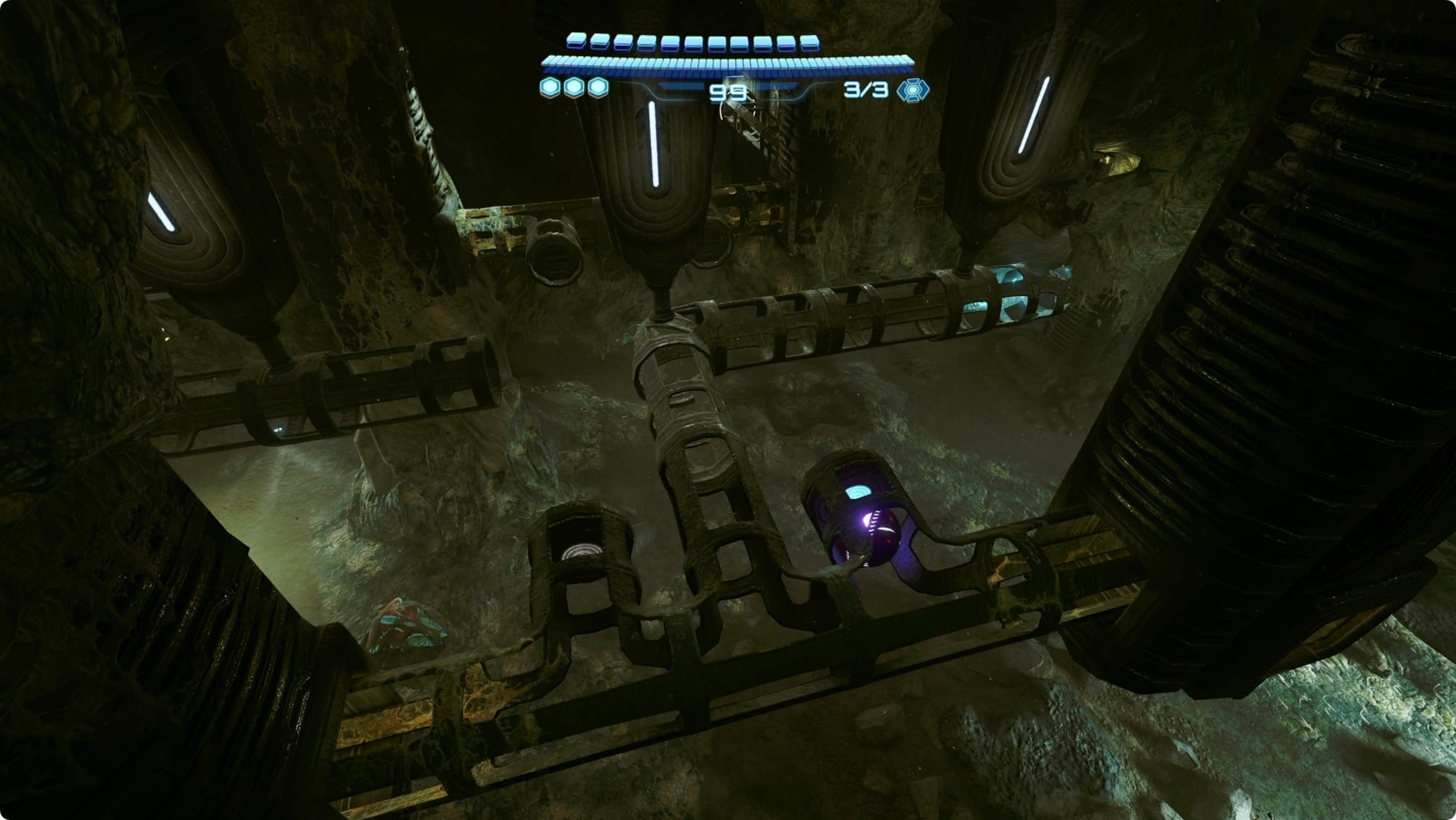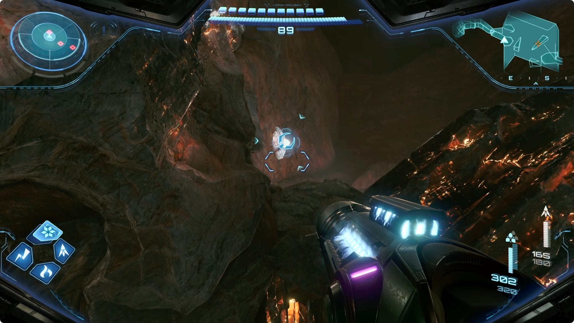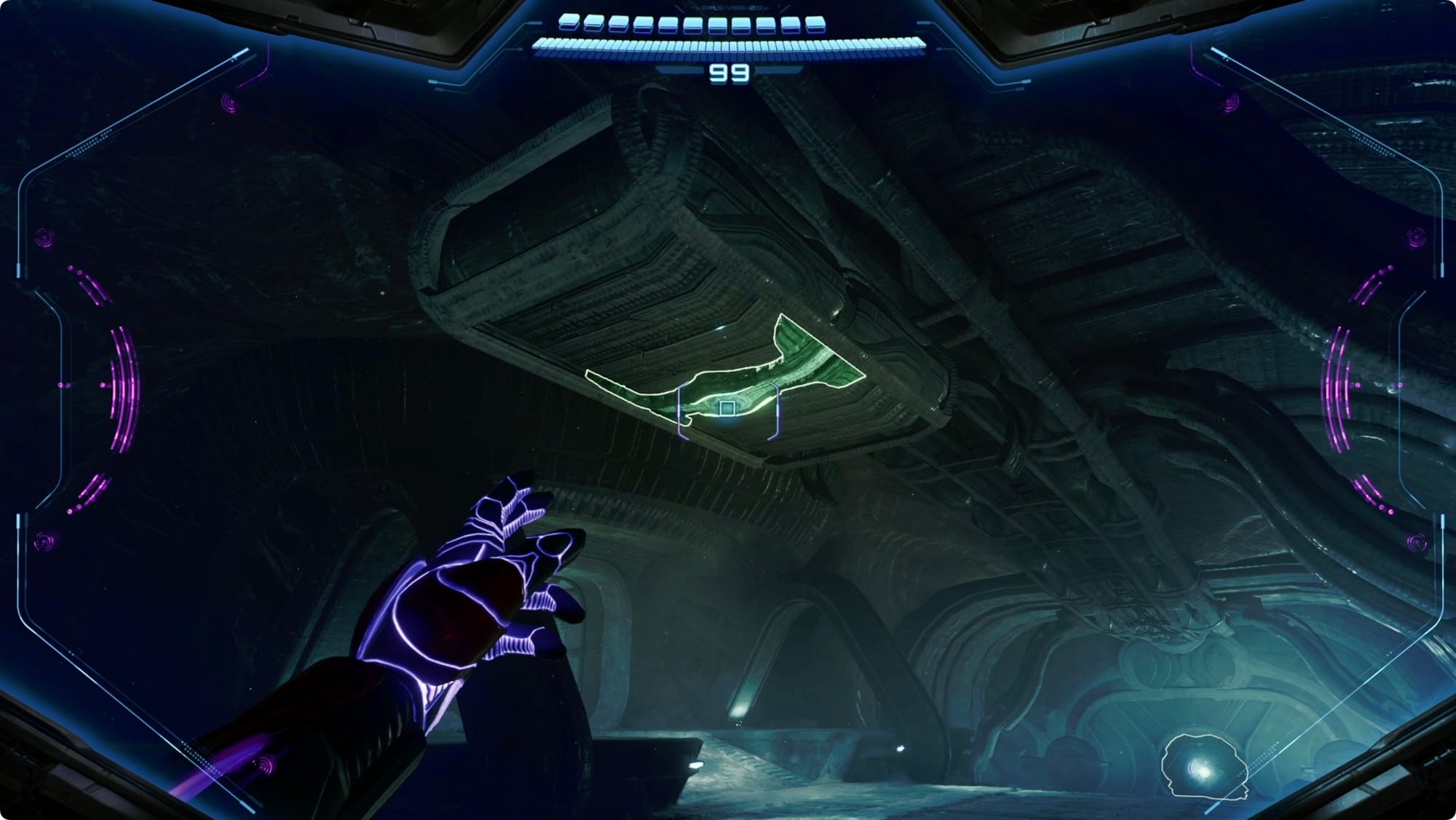 Zurück am Mineneingang nehmen Sie den Aufzug auf Ebene 1. Gehen Sie geradeaus zur Kommandozentrale (dies ist ein guter Zeitpunkt, um an der Speicherstation anzuhalten, wenn Sie vorbeikommen). Suchen Sie im Tunnel auf der Südseite an der Decke nach einer Frachtkapsel. Scannen Sie den Riegel, um ihn zu öffnen, und öffnen Sie dann die Kapsel mit dem Lasso. Springe nach oben, um dir die Shot-Erweiterung im Inneren zu schnappen.