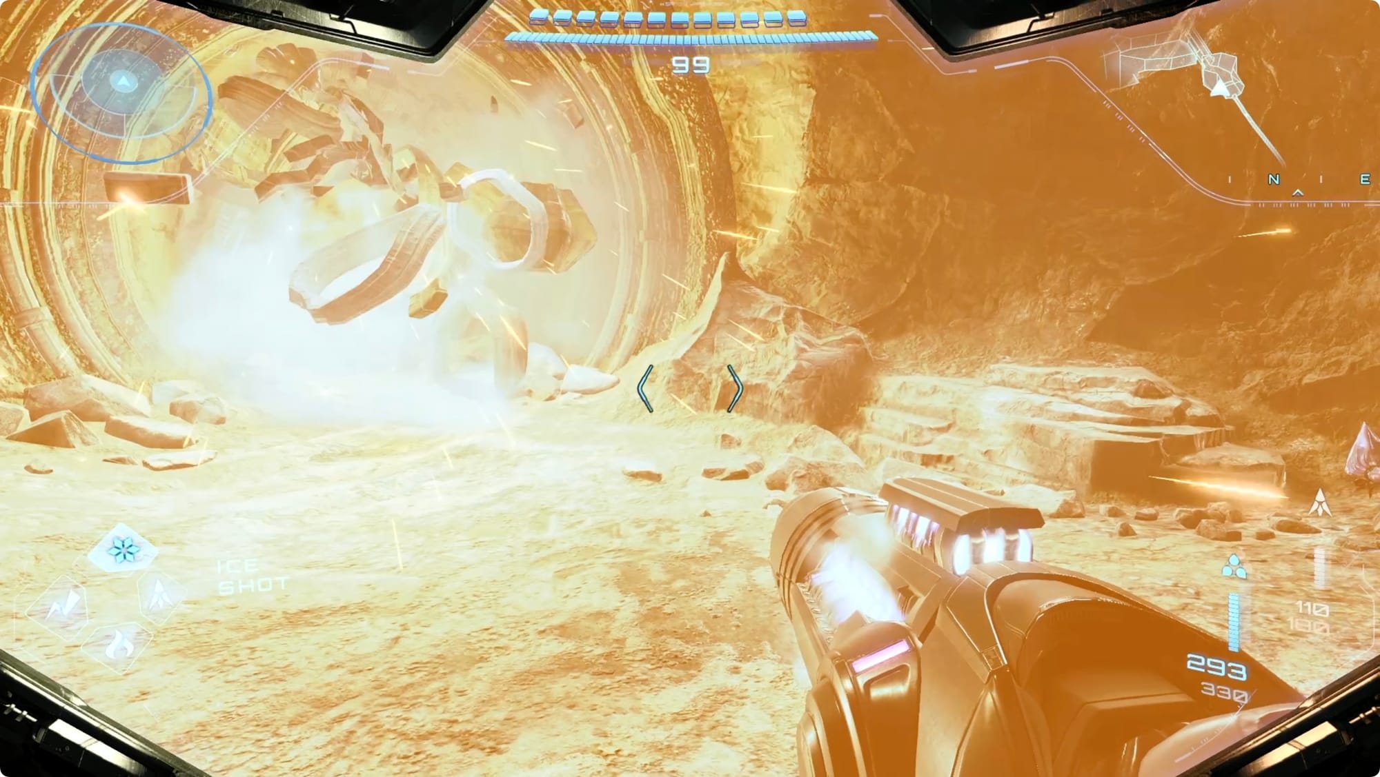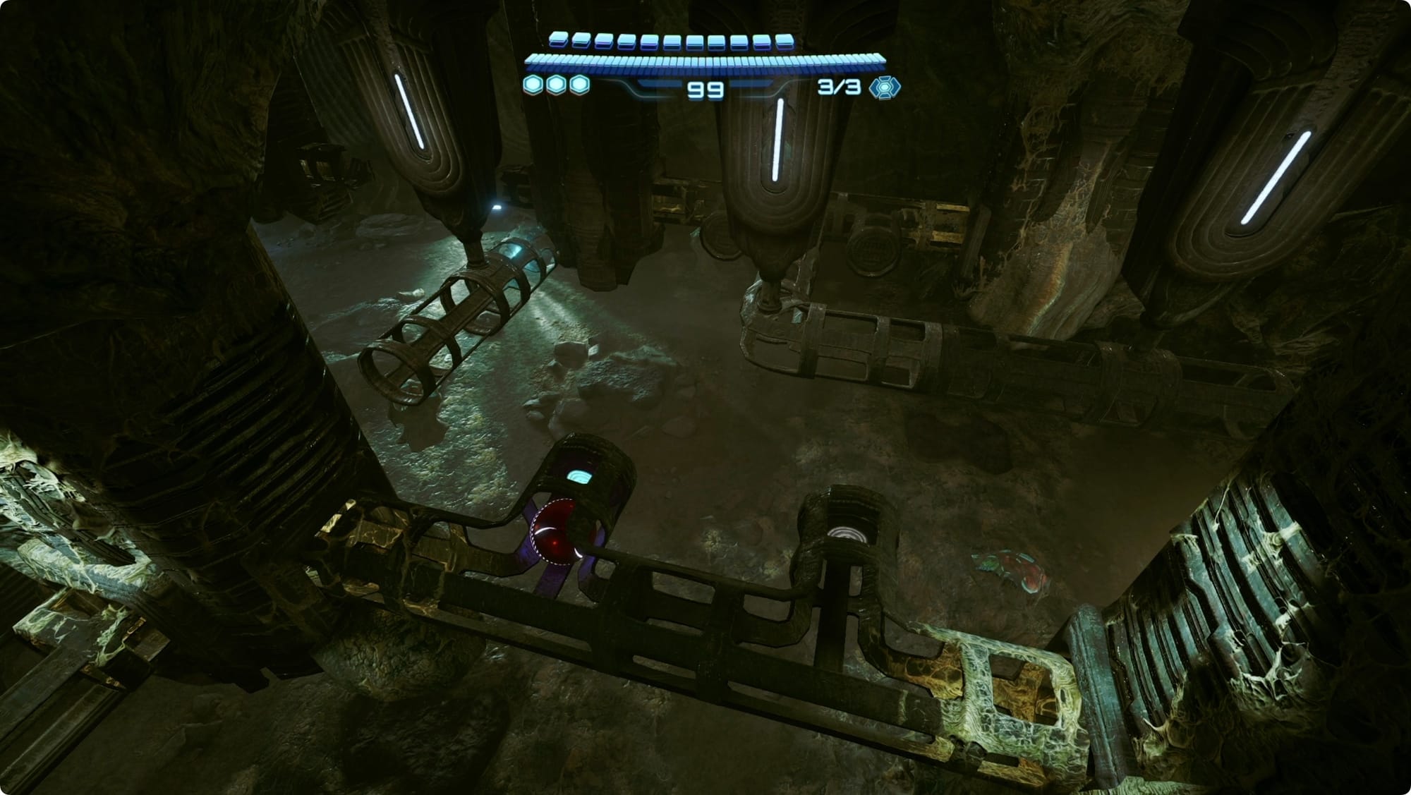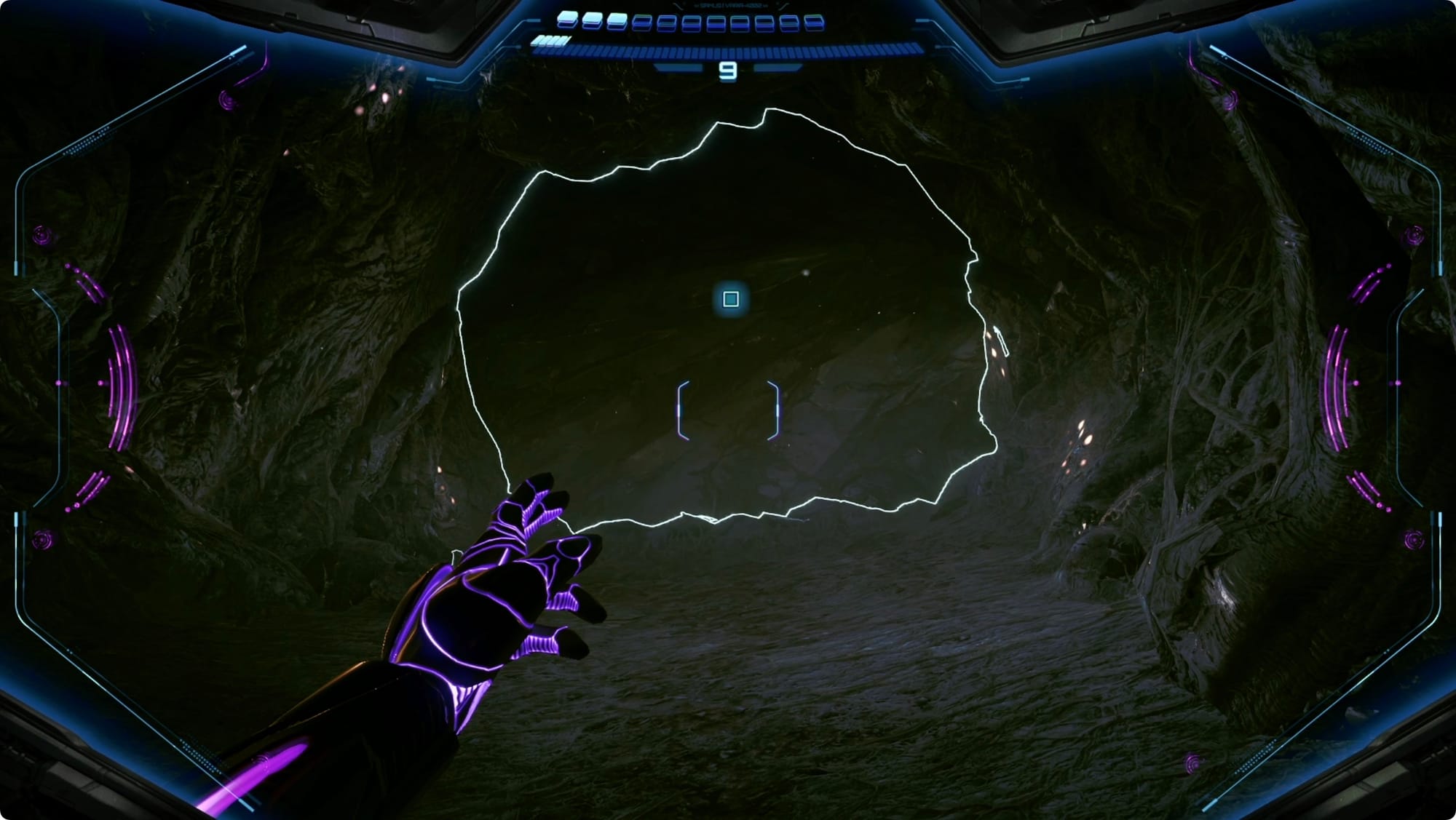 Zurück am Mineneingang nehmen Sie den Aufzug auf Ebene 1. Gehen Sie geradeaus zur Kommandozentrale (dies ist ein guter Zeitpunkt, um an der Speicherstation anzuhalten, wenn Sie vorbeikommen). Suchen Sie im Tunnel auf der Südseite an der Decke nach einer Frachtkapsel. Scannen Sie den Riegel, um ihn zu öffnen, und öffnen Sie dann die Kapsel mit dem Lasso. Springe nach oben, um dir die Shot-Erweiterung im Inneren zu schnappen.