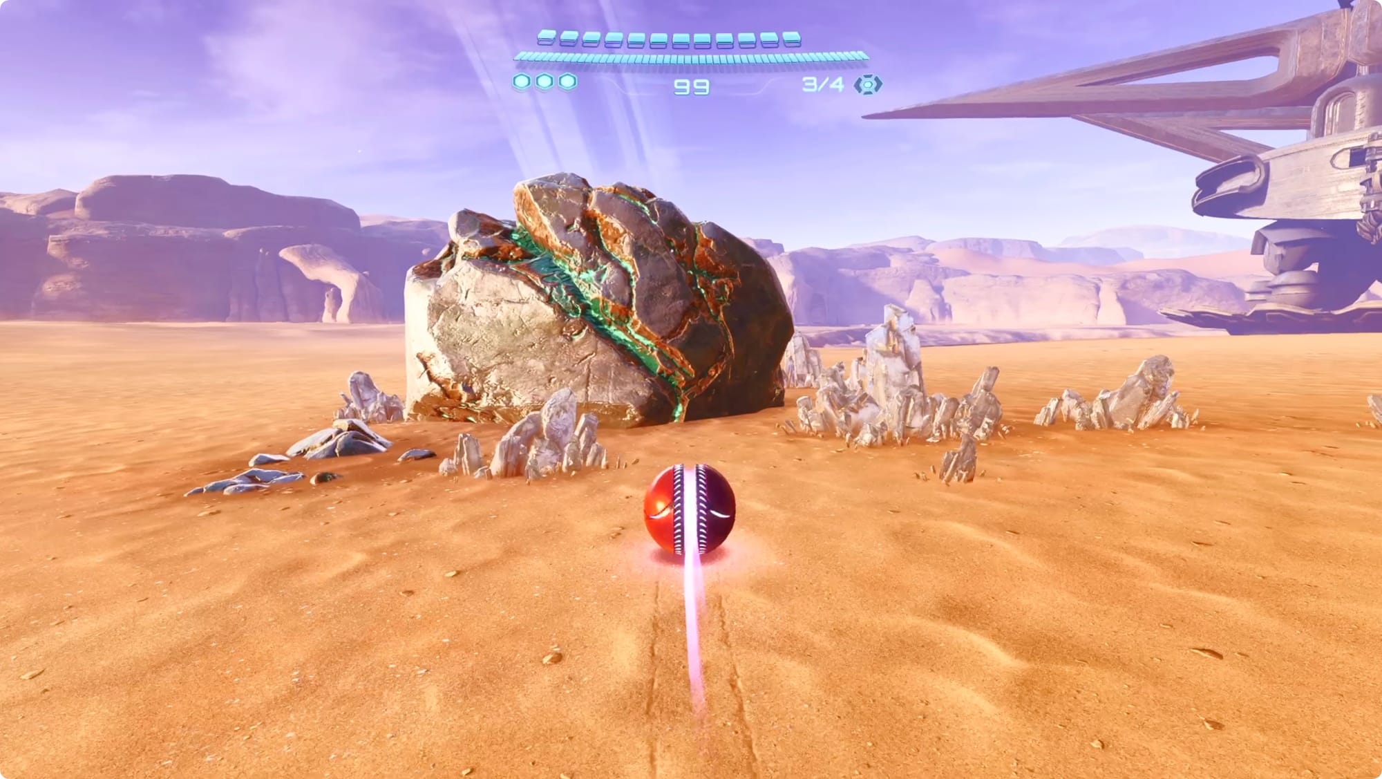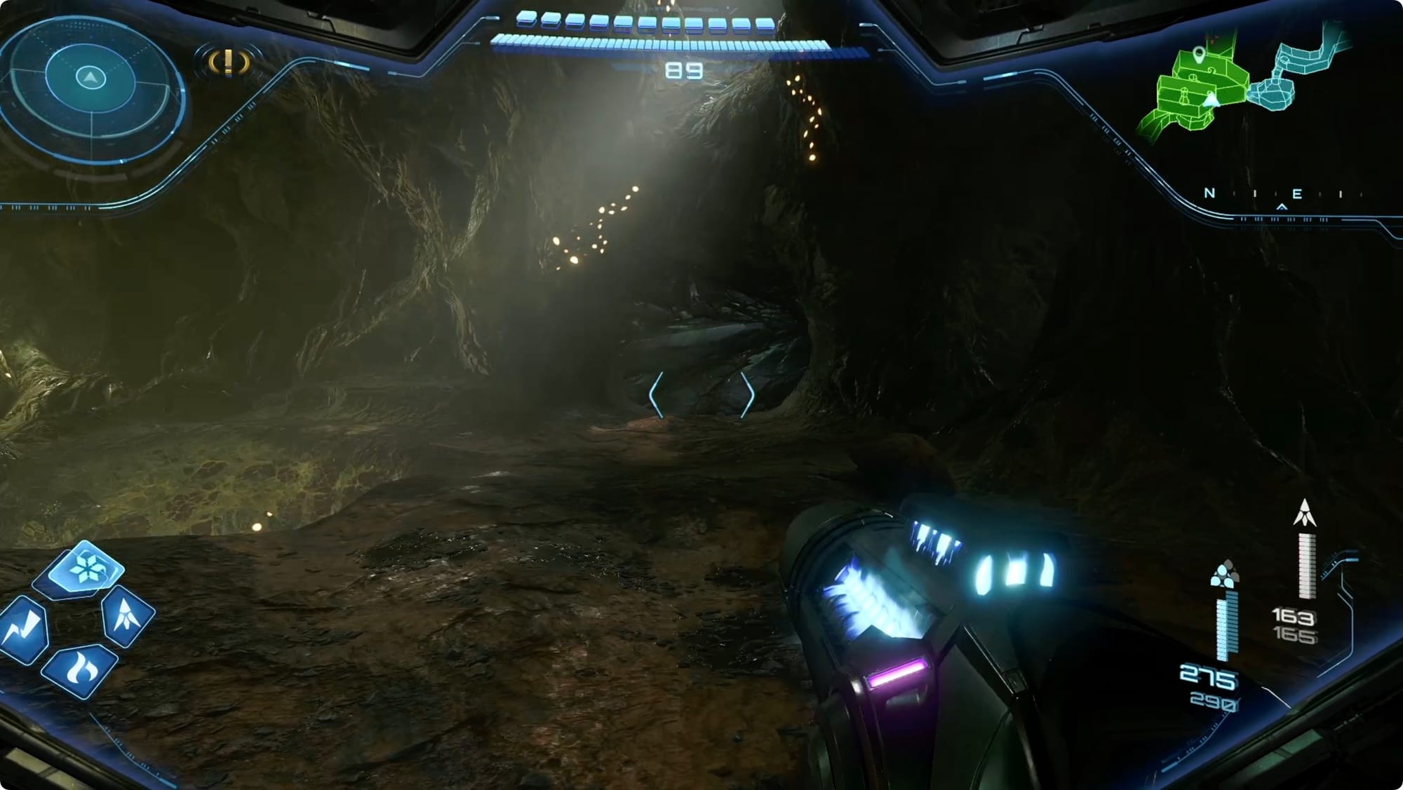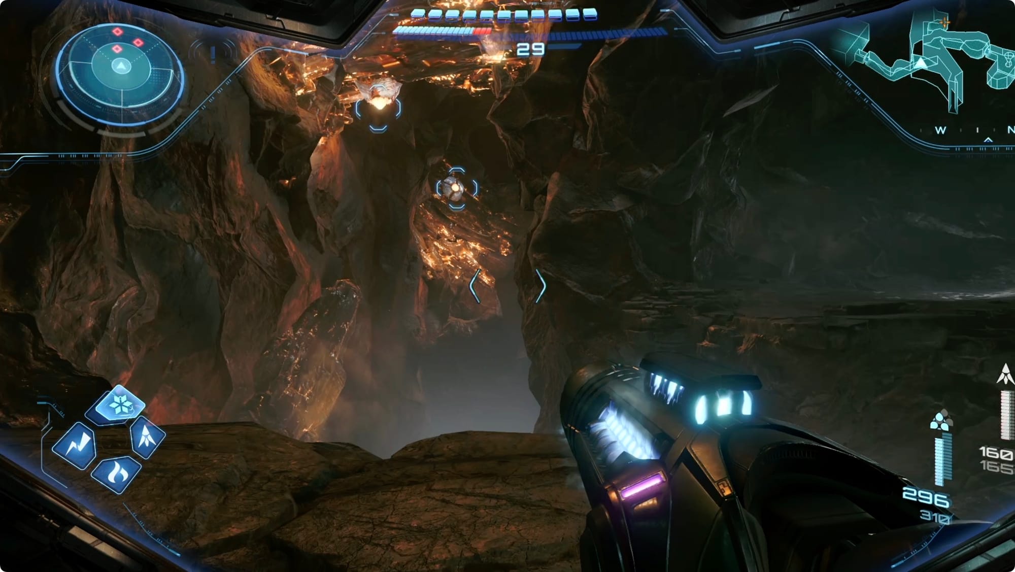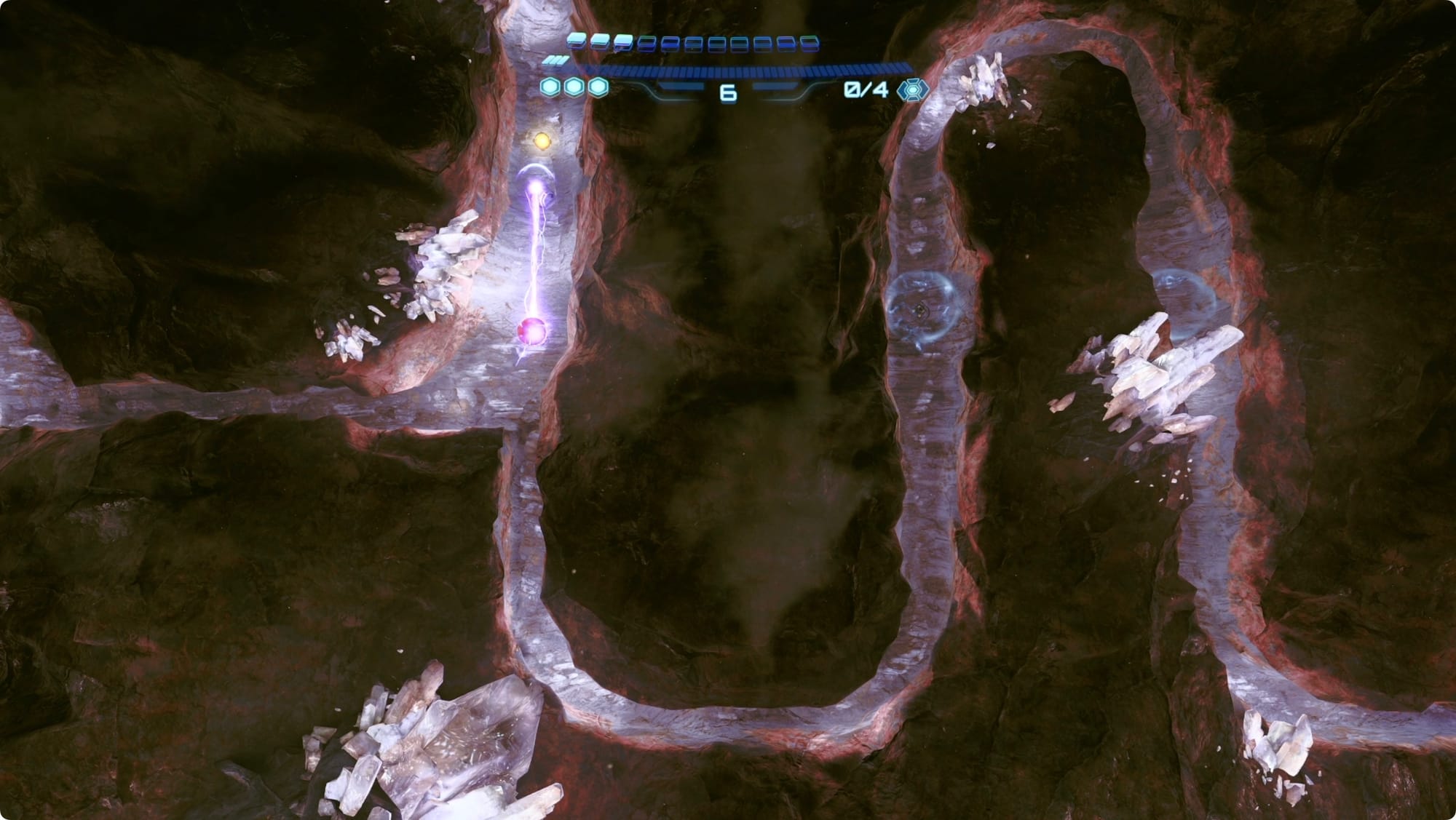 Zurück im Hauptraum, fallen Sie durch das Loch und gehen Sie bis zur zweiten Ebene der Minen weiter. Gehen Sie weiter bis zum schmalen Spalt, wo Sie eine Lücke überspringen müssen. Drehen Sie sich dabei um und schauen Sie nach links. Benutze die drei Kristallkriecher, um für eine Raketenerweiterung tiefer in den Spalt vorzudringen.