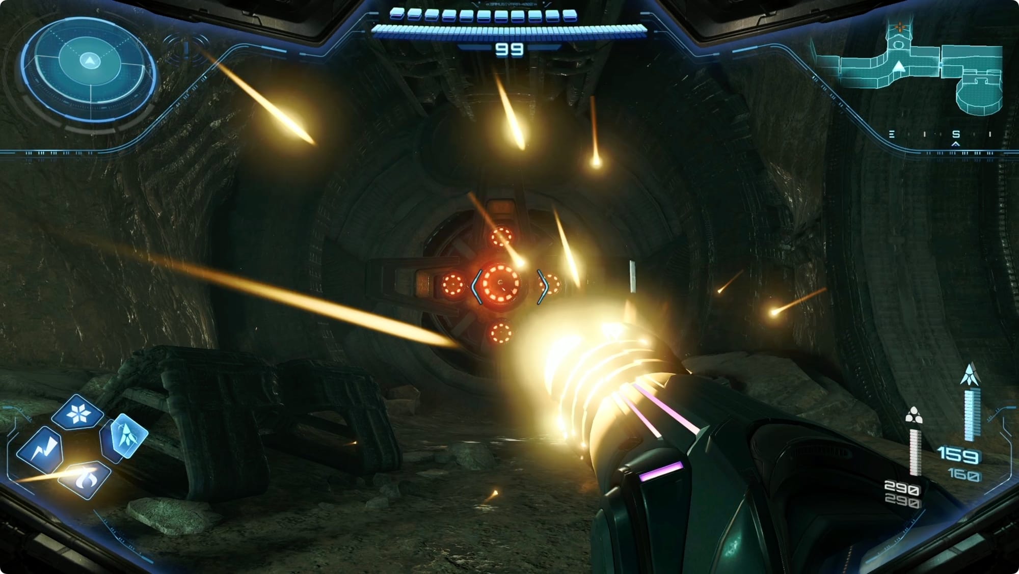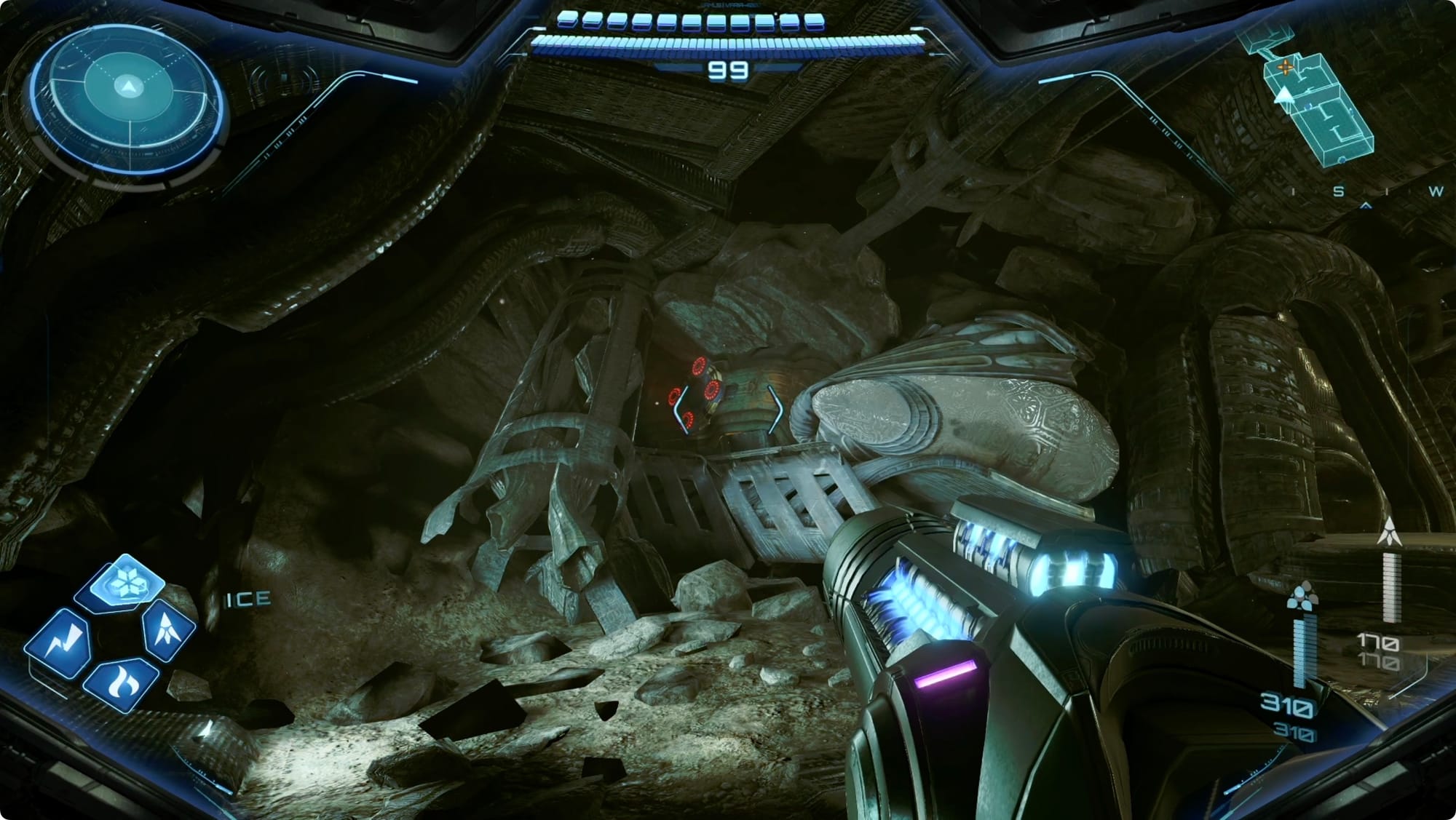 Im Norden im Easing Tunnel biegen Sie rechts ab. Schlagen Sie mit einer Kraftbombe auf den Bombenschlitz, um einen Minenwagen anzuheben. Super Missile das darin enthaltene Erz für eine Missile-Erweiterung (und um ein paar Grievers herbeizurufen).