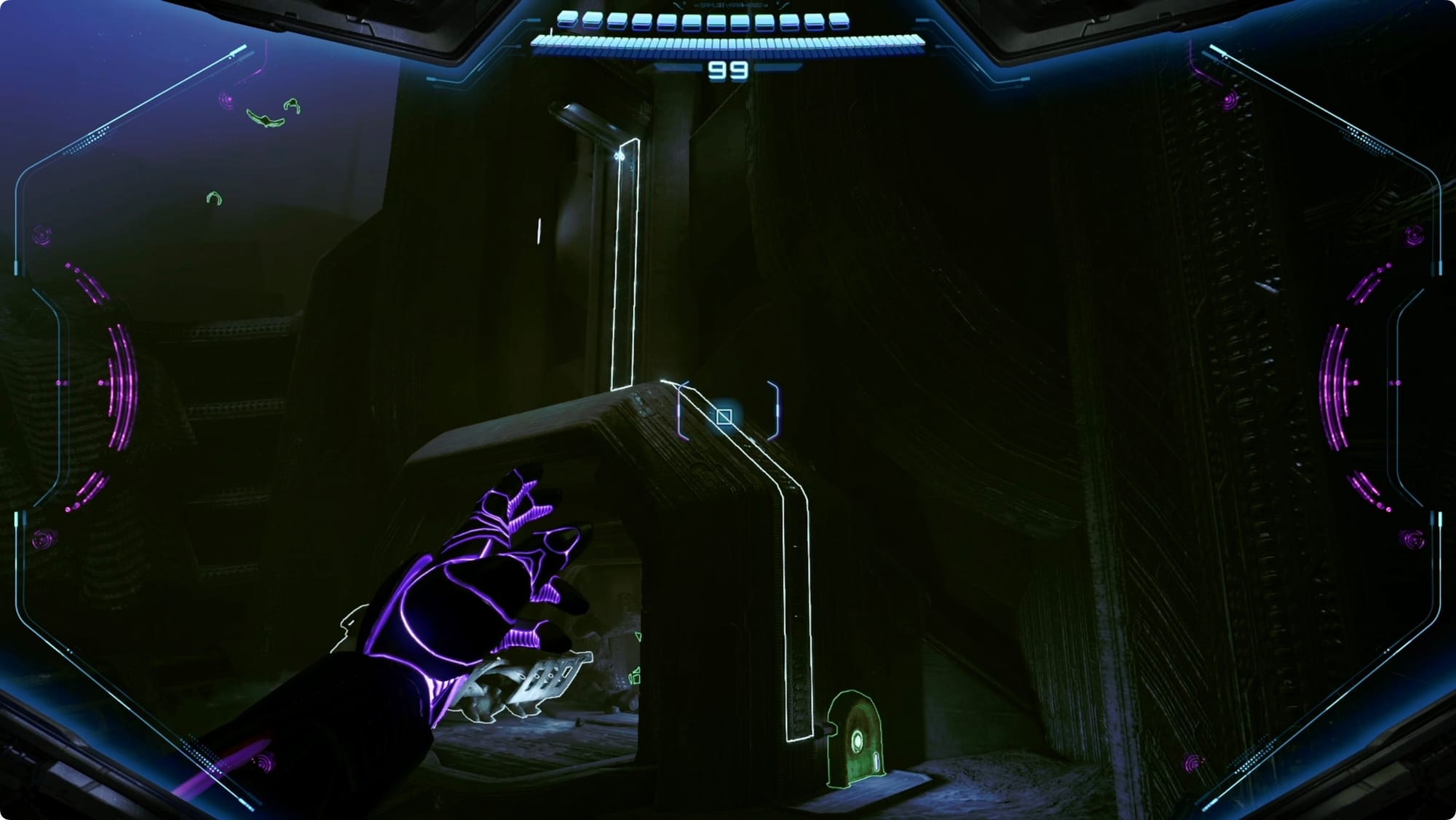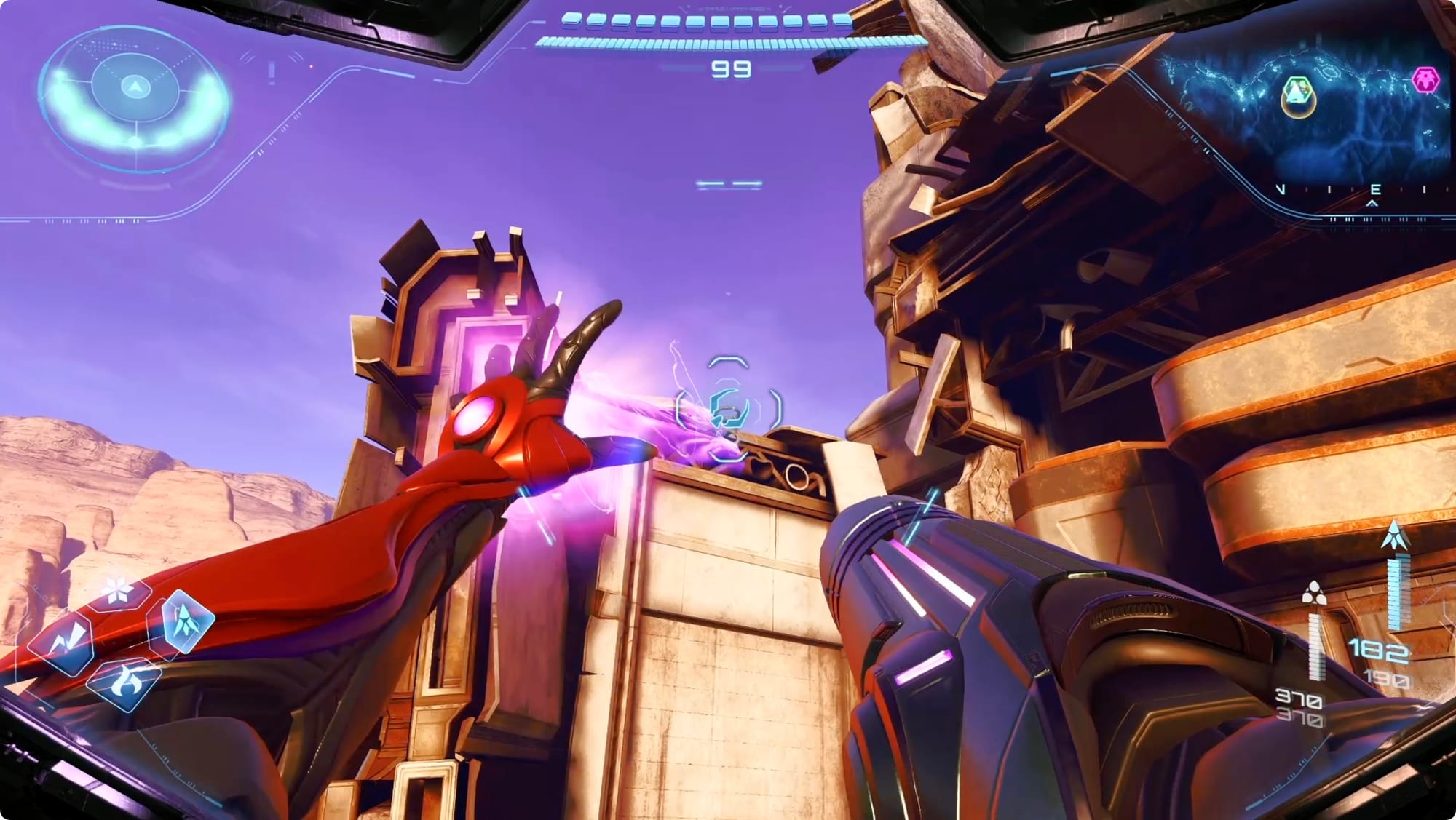 Bevor Sie hineingehen, schauen Sie sich auf der rechten Seite des Eingangs um. Schieße auf den Sensor und klettere mit der Magnetschiene nach oben. Ungefähr zu dem Zeitpunkt, an dem Sie das Dach erreichen, lässt die Ladung nach. Verwenden Sie einen Kontrollschuss, um die Schienen wieder mit Energie zu versorgen, und klettern Sie dann nach oben, um eine weitere Schusserweiterung zu erhalten.