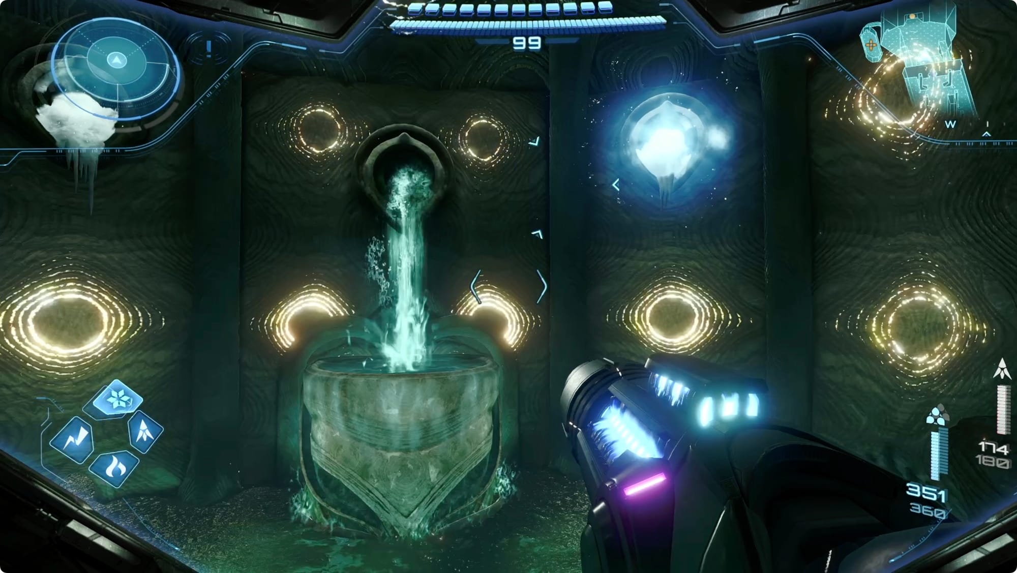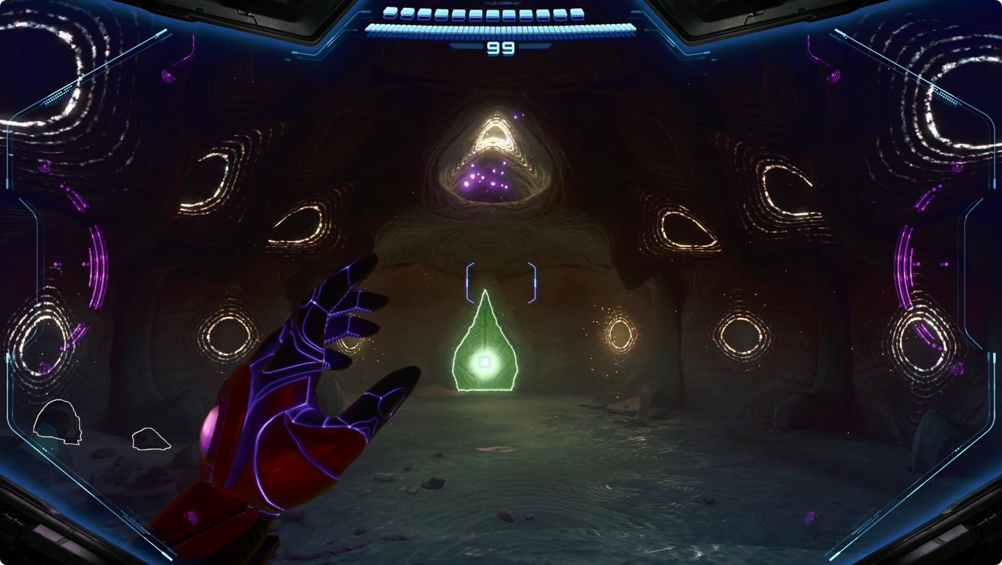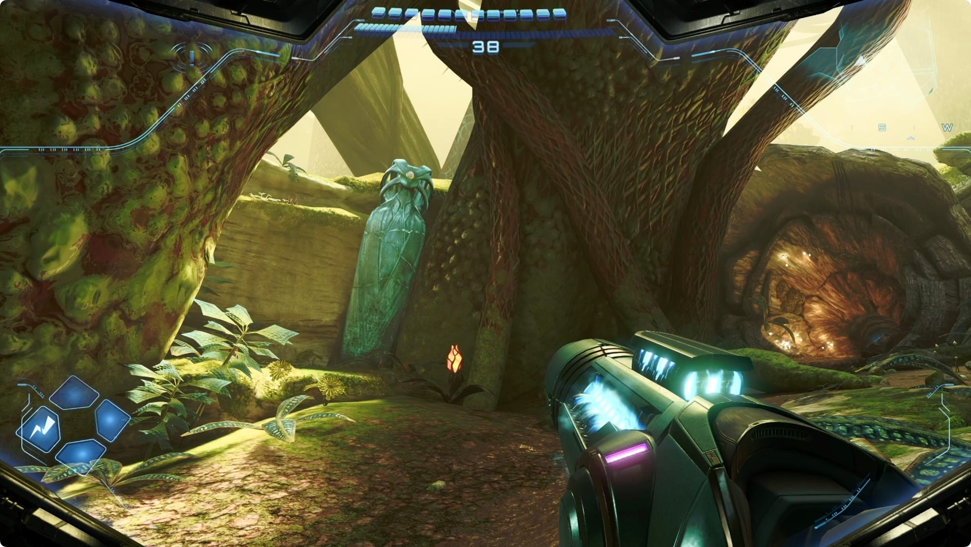 Nehmen Sie den Cargo Launcher noch nicht. Benutzen Sie stattdessen den Tunnel auf der linken Seite, um wieder von vorne zu beginnen. Achten Sie im allerersten Bereich, der Stillen Lichtung, auf der linken Seite auf eine Lamorn-Statue. Power Bomb es für eine Psychic Power Bomb-Erweiterung.