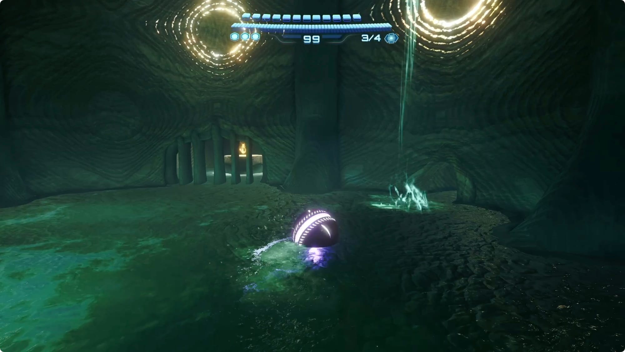 Begeben Sie sich zum Rings of Stone-Schrein. Drehen Sie sich im letzten Raum bei der letzten Statue um und schauen Sie zur Decke hoch. Fliegen Sie dort mit einem Kontrollstrahl in den Tunnel, um eine winzige Tür hinter der Statue zu öffnen. Rollen Sie durch, um eine Schusserweiterung zu finden.