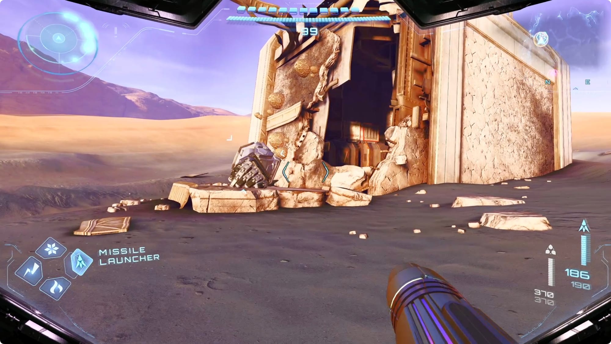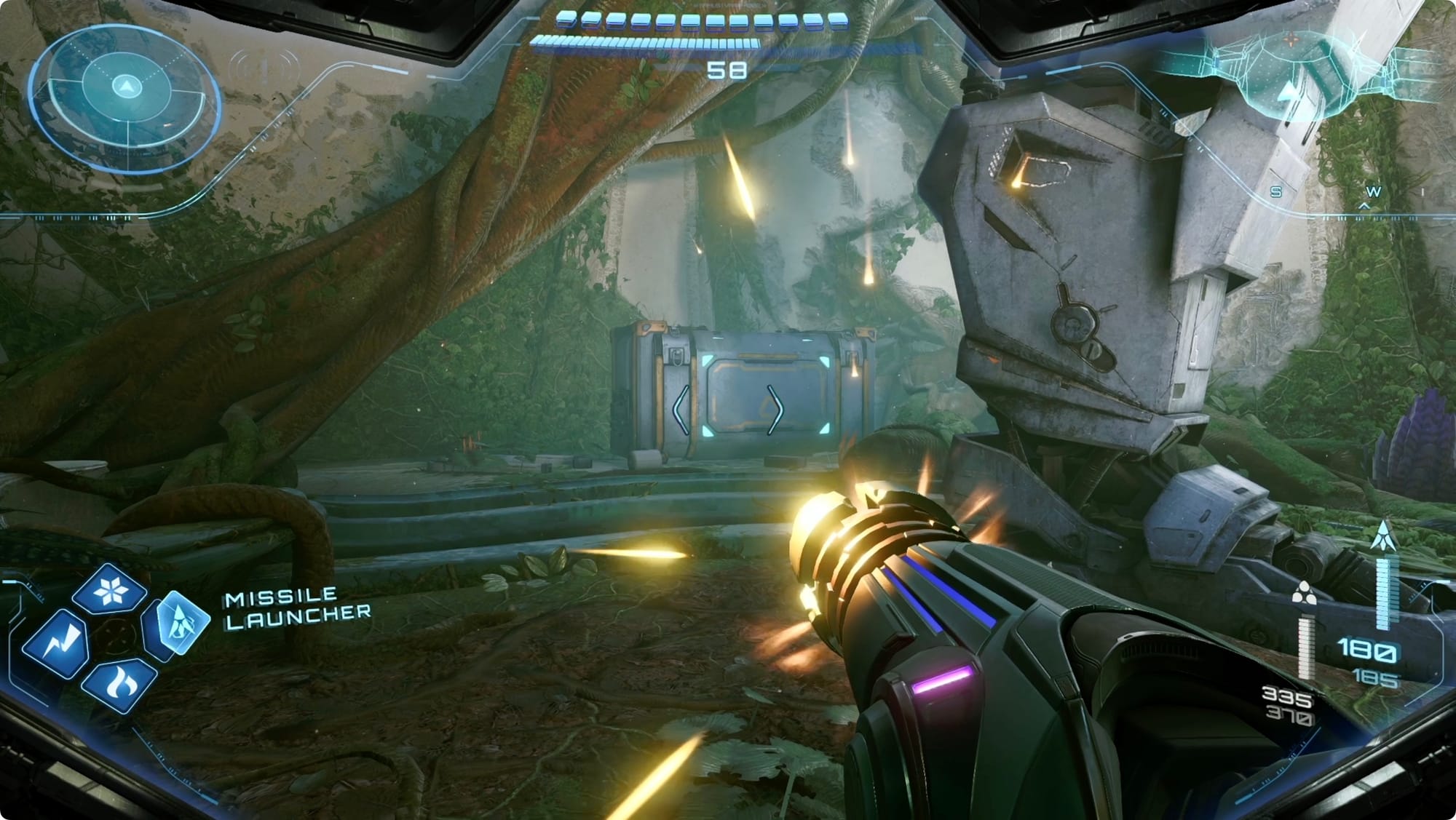 Gehen Sie nach Norden zum Mech – endlich können Sie die Kiste dahinter mit einer Superrakete beschießen. Schnappen Sie sich die Raketenerweiterung darin.