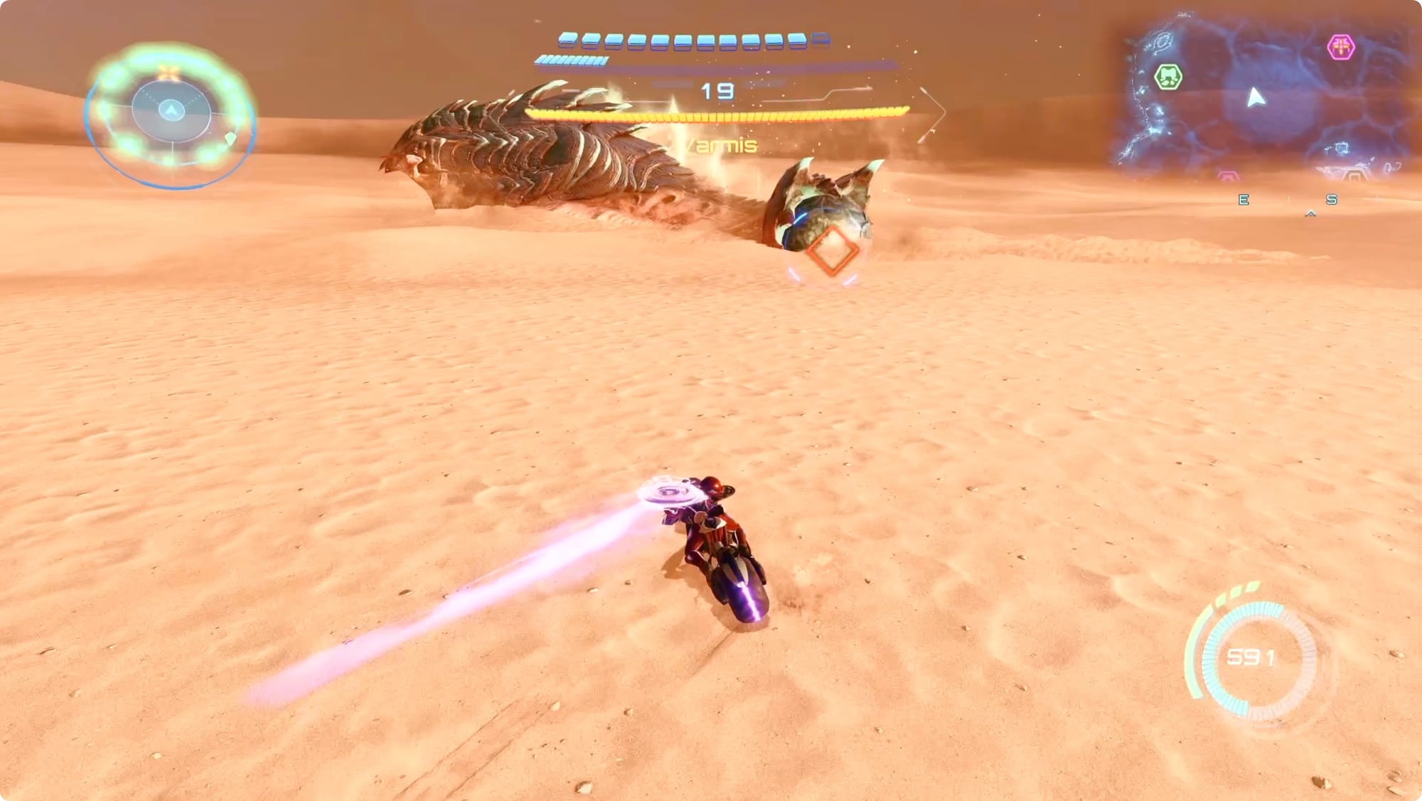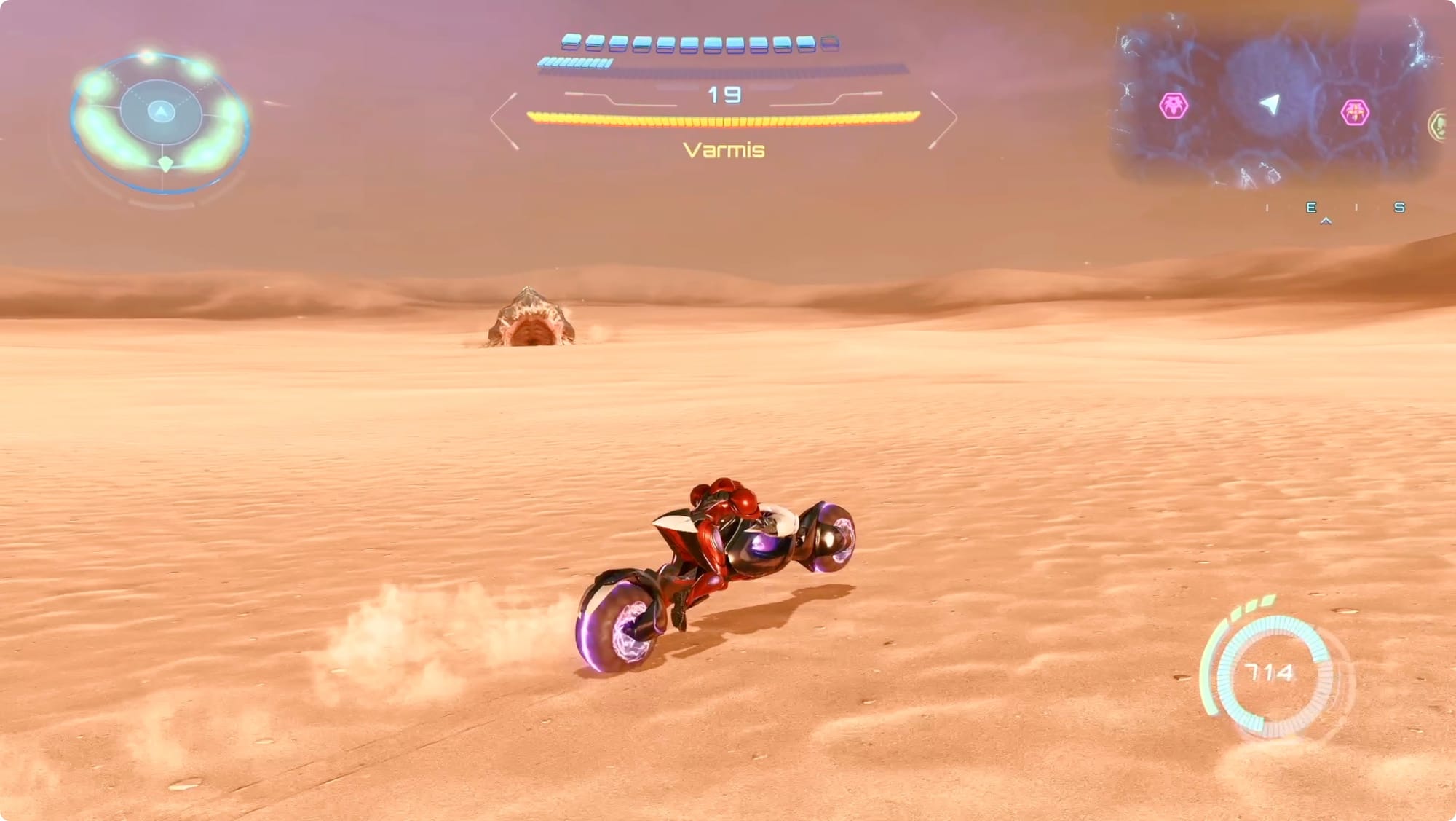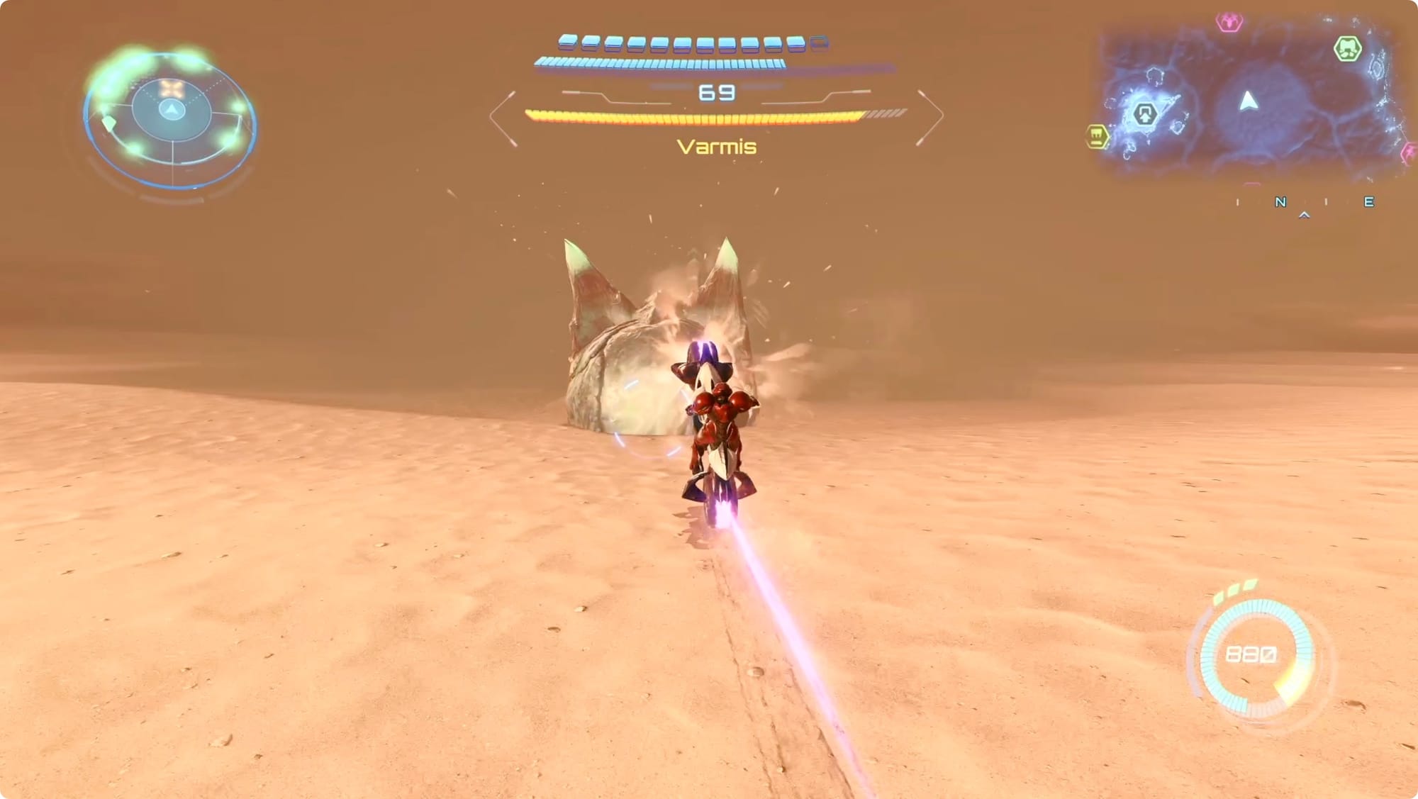 Wenn Varmis an Ihnen vorbeikommt, tippen Sie auf den linken Auslöser, um eine Kehrtwende durchzuführen. Wenn Sie sich hinter Varmis befinden, halten Sie A gedrückt, um auf die leuchtende Glühbirne an seinem Schwanz zu zielen. Ein Treffer fügt ihm keinen Schaden zu, verlangsamt ihn jedoch.