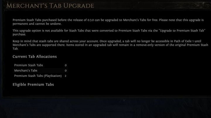 Das größere Problem und das, das viele Spieler frustriert hat, ist, dass Premium -Registerkarten aus normalen Stash -Registerkarten aufgerüstet wurden, bevor der Patch auch nicht konvertiert werden kann. Mit anderen Worten, wenn Sie sie ursprünglich nicht als Premium -Registerkarten gekauft haben, haben Sie kein Glück. Es ist eine verwirrende Einschränkung, und um die Sache noch schlimmer zu machen, kommunizierte GGG sie vor dem Start nicht klar und lässt viele Spieler blind, sobald das System live gegangen ist. Seitdem haben sie die Beschreibung aktualisiert, damit jeder die Situation verstehen kann, aber dies ist etwas, das wirklich im Voraus geklärt werden sollte.