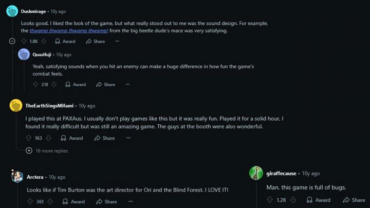 Aber zum Glück ist dies nach dem Durchsuchen des ursprünglichen Beitrags nicht ganz repräsentativ für den Kommentarbereich. Viele weitere der besten Kommentare waren aufgeregt und unterstützend. Ein Benutzer schrieb: „Ich habe das bei Paxaus gespielt. Ich spiele normalerweise keine solchen Spiele, aber es hat wirklich Spaß gemacht. Ich habe es für eine solide Stunde gespielt, ich fand es wirklich schwierig, war aber immer noch ein erstaunliches Spiel.“ Eine andere Person sagte: „Sieht so aus, als wäre Tim Burton der Art Director von Ori und The Blind Forest. Ich liebe es!“ Während es definitiv ein paar Hasser gab, gab es auch viele Unterstützer.
