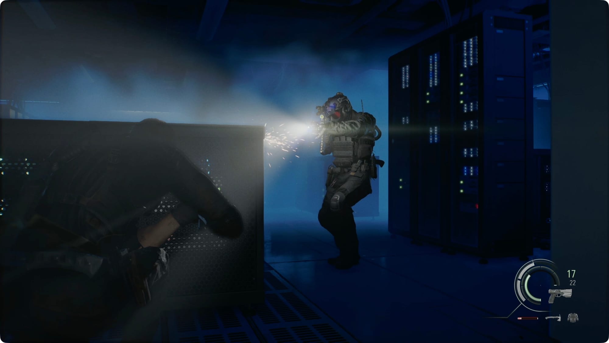 Diese Wachen machen keinen Scherz, seien Sie also bereit, wenn Sie zurück in den Serverraum gehen. Halten Sie sich an die Ränder und nutzen Sie die verstreuten Kanister, um eine gewisse Nebeldecke zu erzeugen.