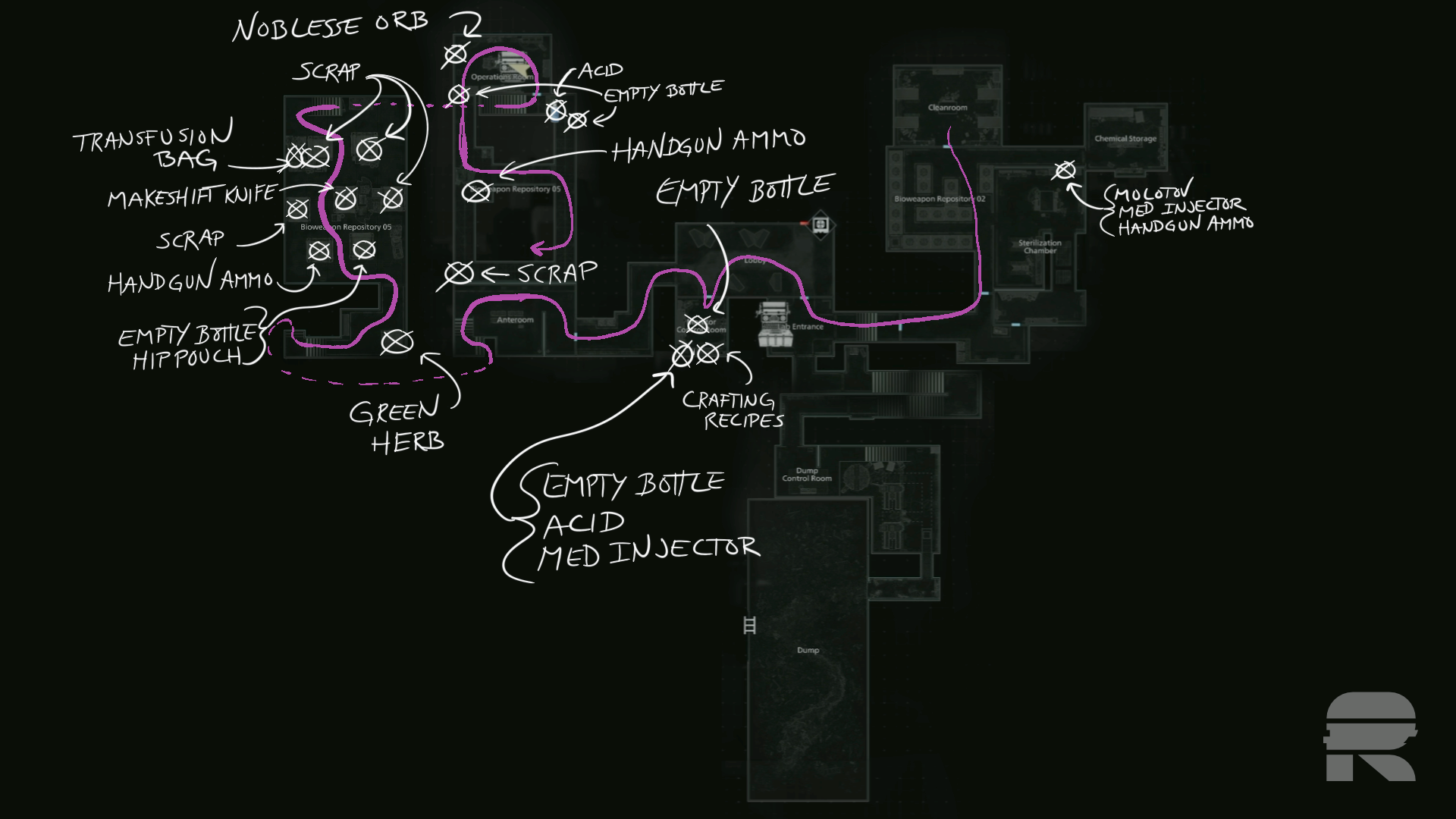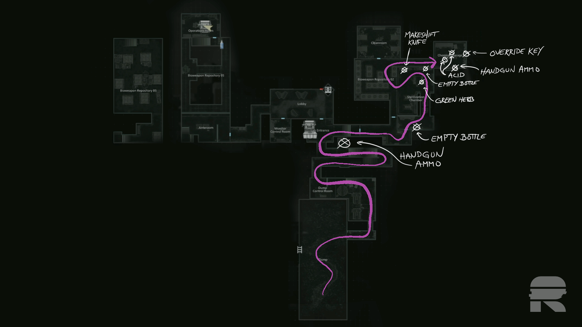 Überprüfen Sie unten den Regenschirmbehälter auf ein grünes Kraut und den Safecode der Sterilisationskammer – R10, L90, R20. Gehen Sie den ganzen Weg zurück und verwenden Sie ihn für einen Molotow, einen Med-Injektor und etwas Handfeuerwaffenmunition.