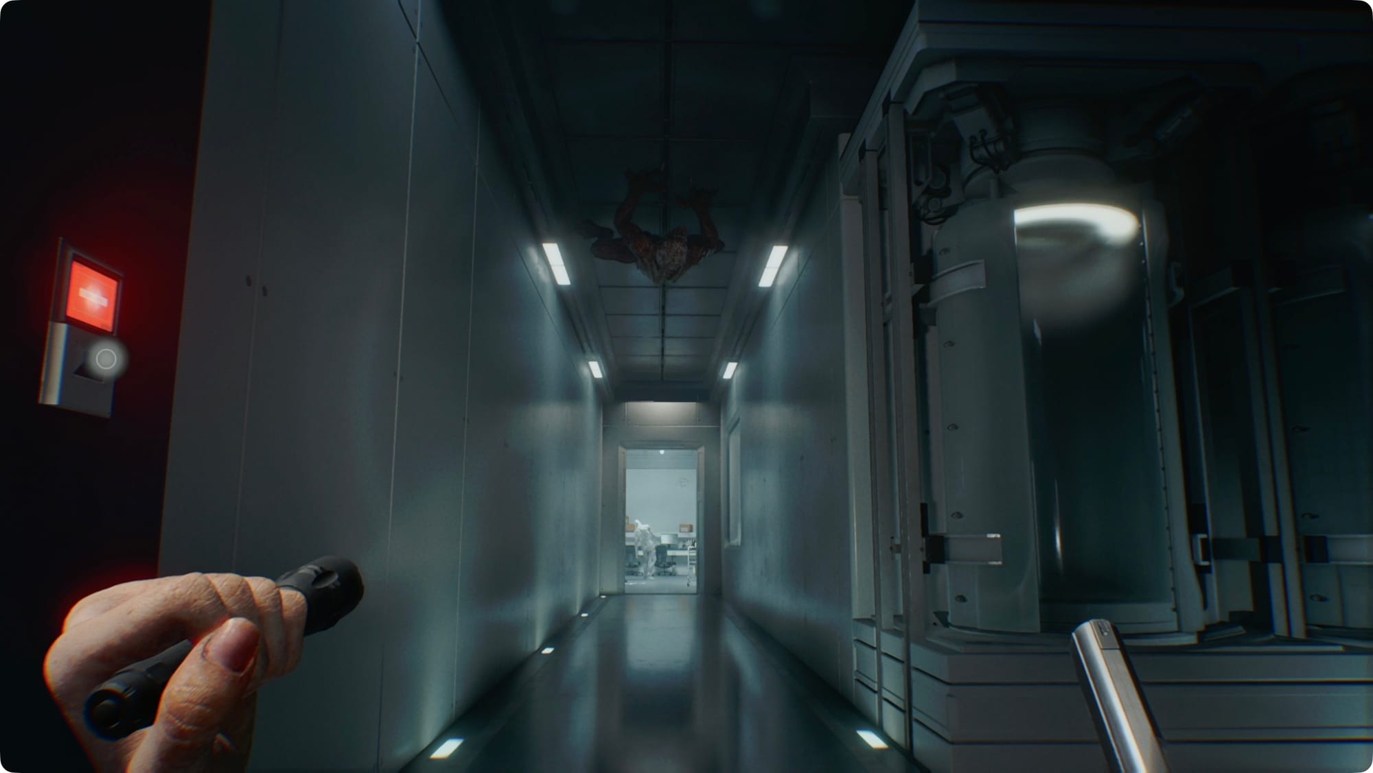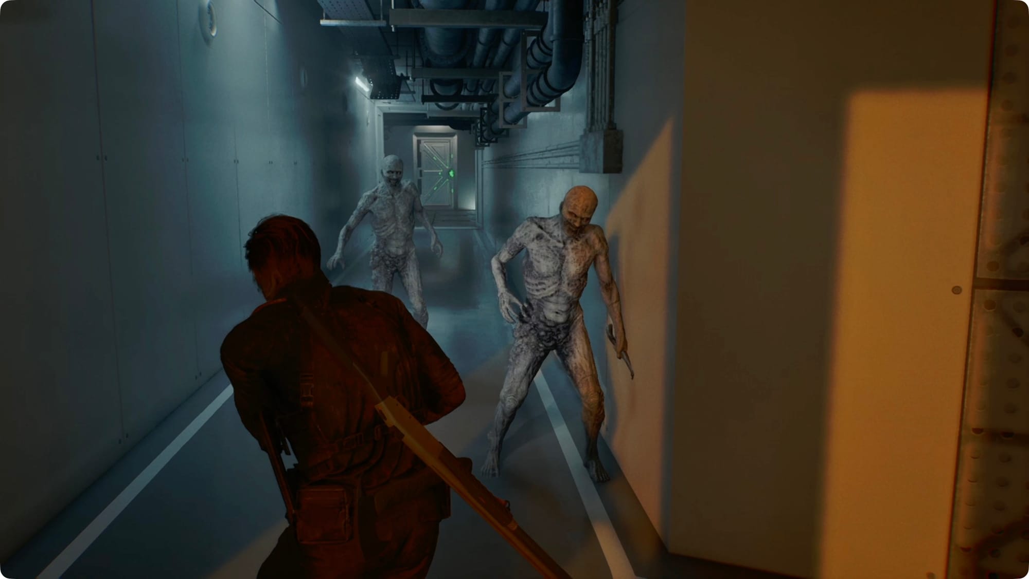 Biegen Sie rechts ab und beobachten Sie dann die Decke der langen Halle, die nach Osten führt. Schleichen Sie sich an diesem Licker vorbei (oder erschießen Sie ihn).