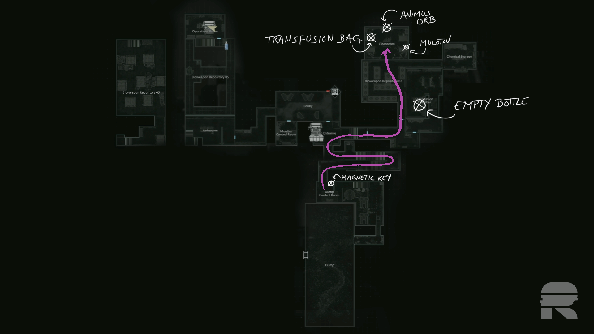 Rechts ist ein Molotow (und ein Zombie). Öffnen Sie im hinteren Teil des Raums den Koffer für den Animus-Kugel-Schlüsselgegenstand. Nehmen Sie auf der linken Seite den Transfusionsbeutel.