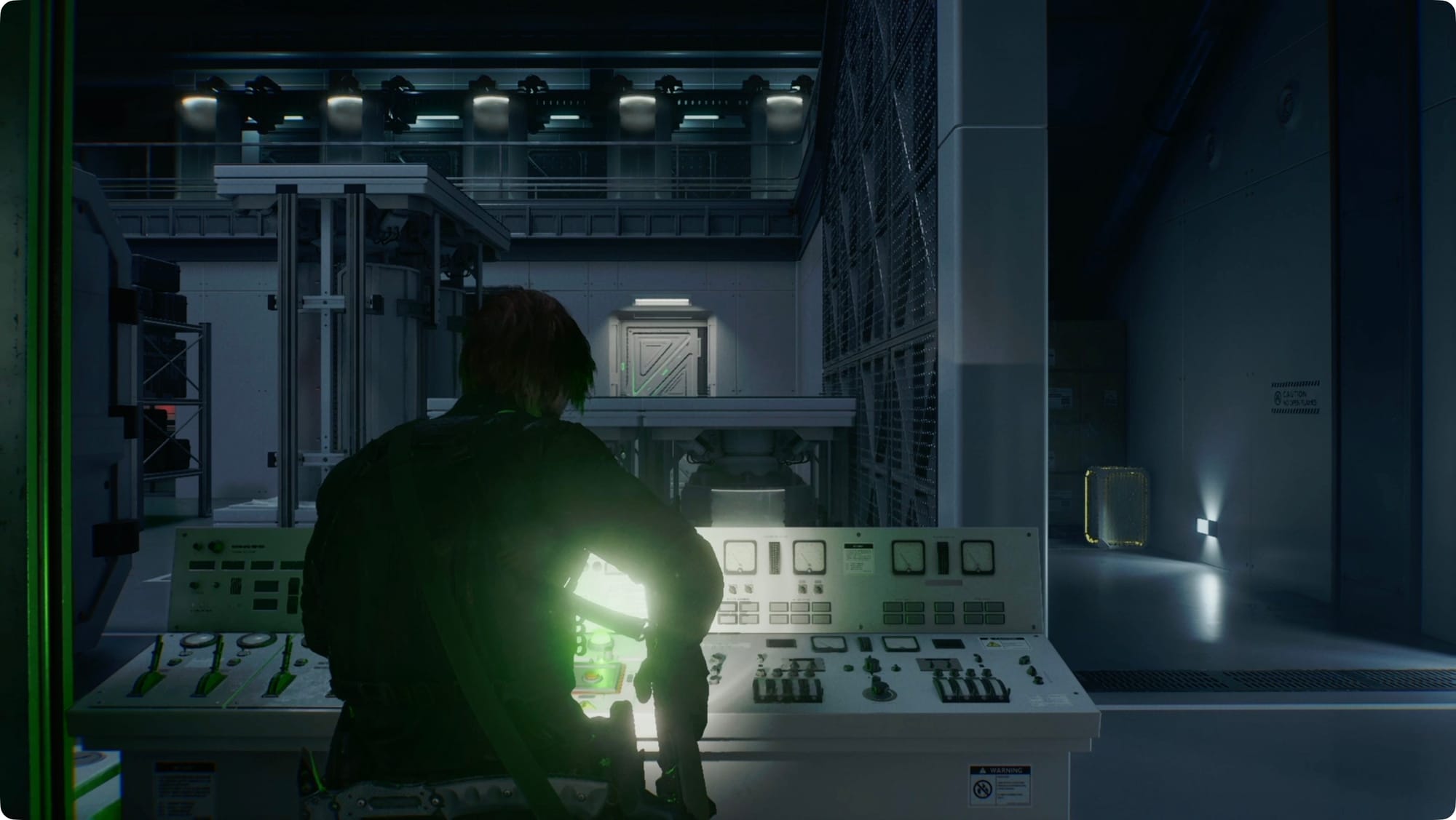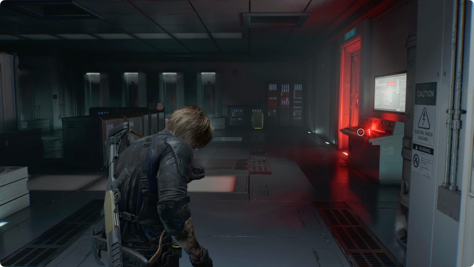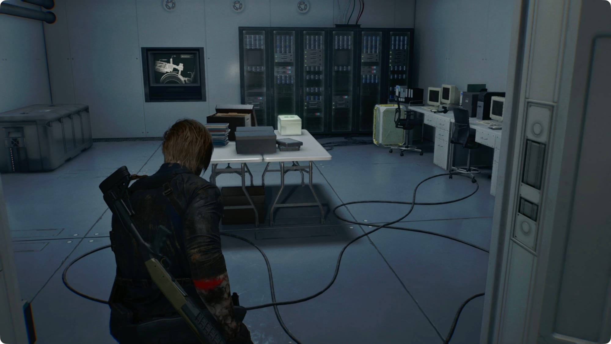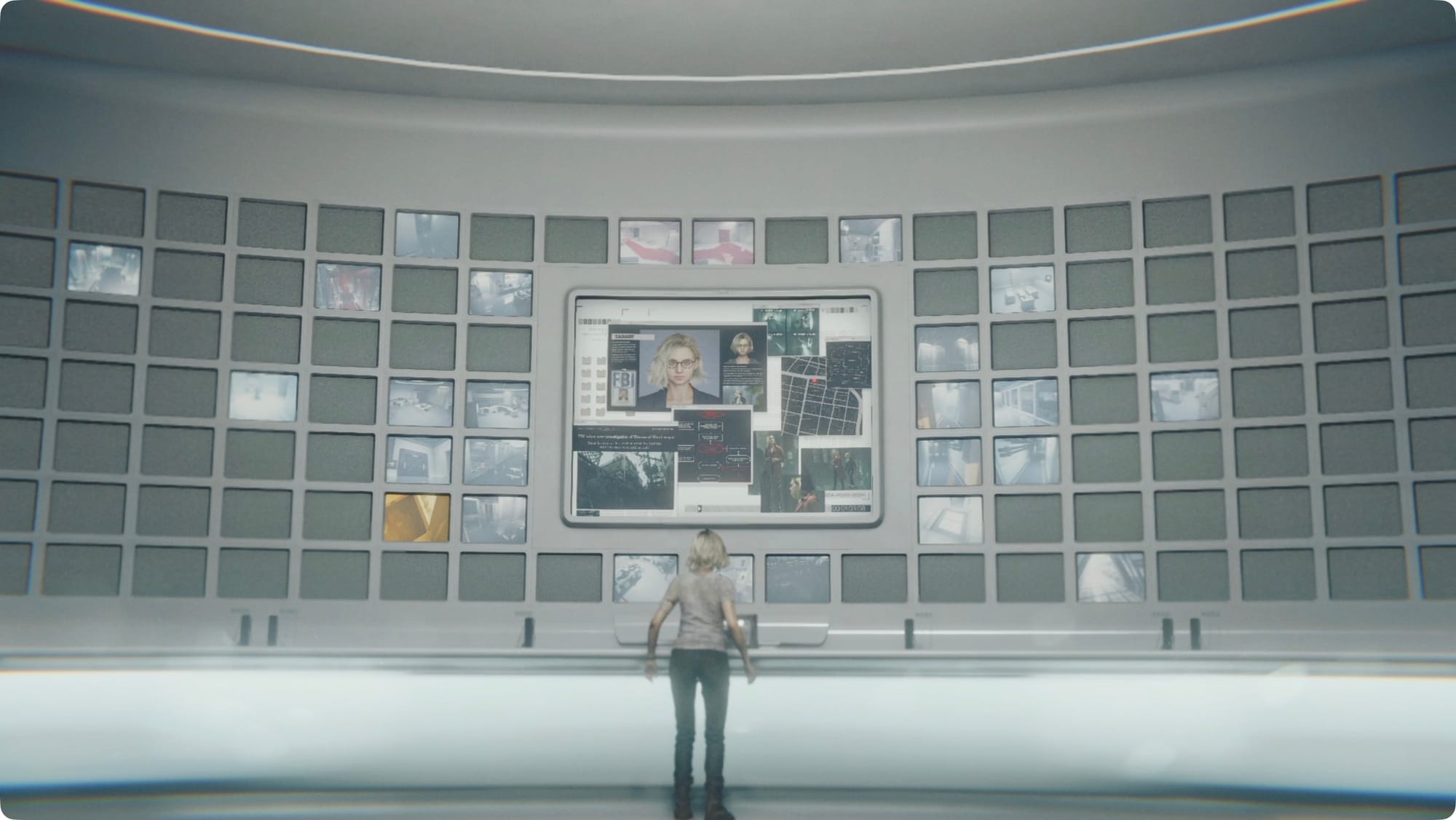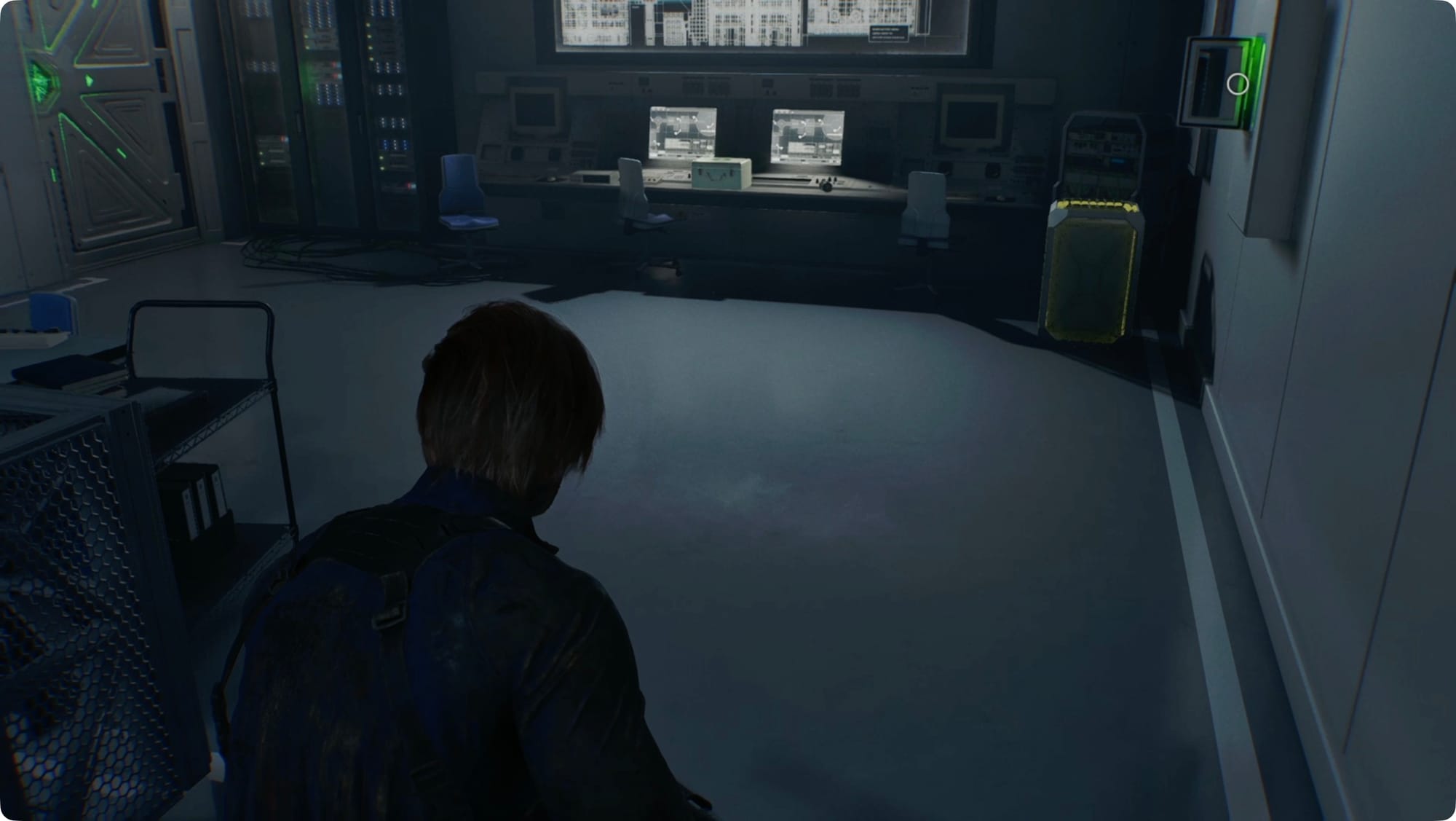Gehen Sie zur riesigen Bildschirmwand und interagieren Sie mit dem Terminal. Für eine Zwischensequenz.