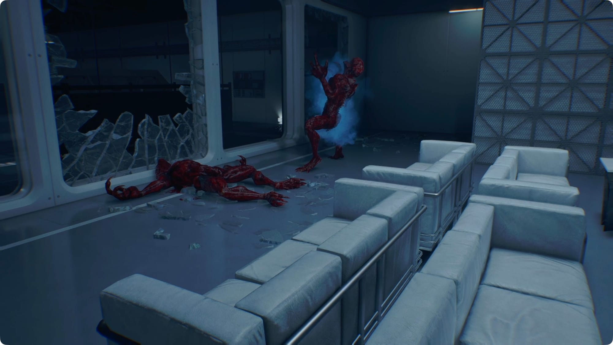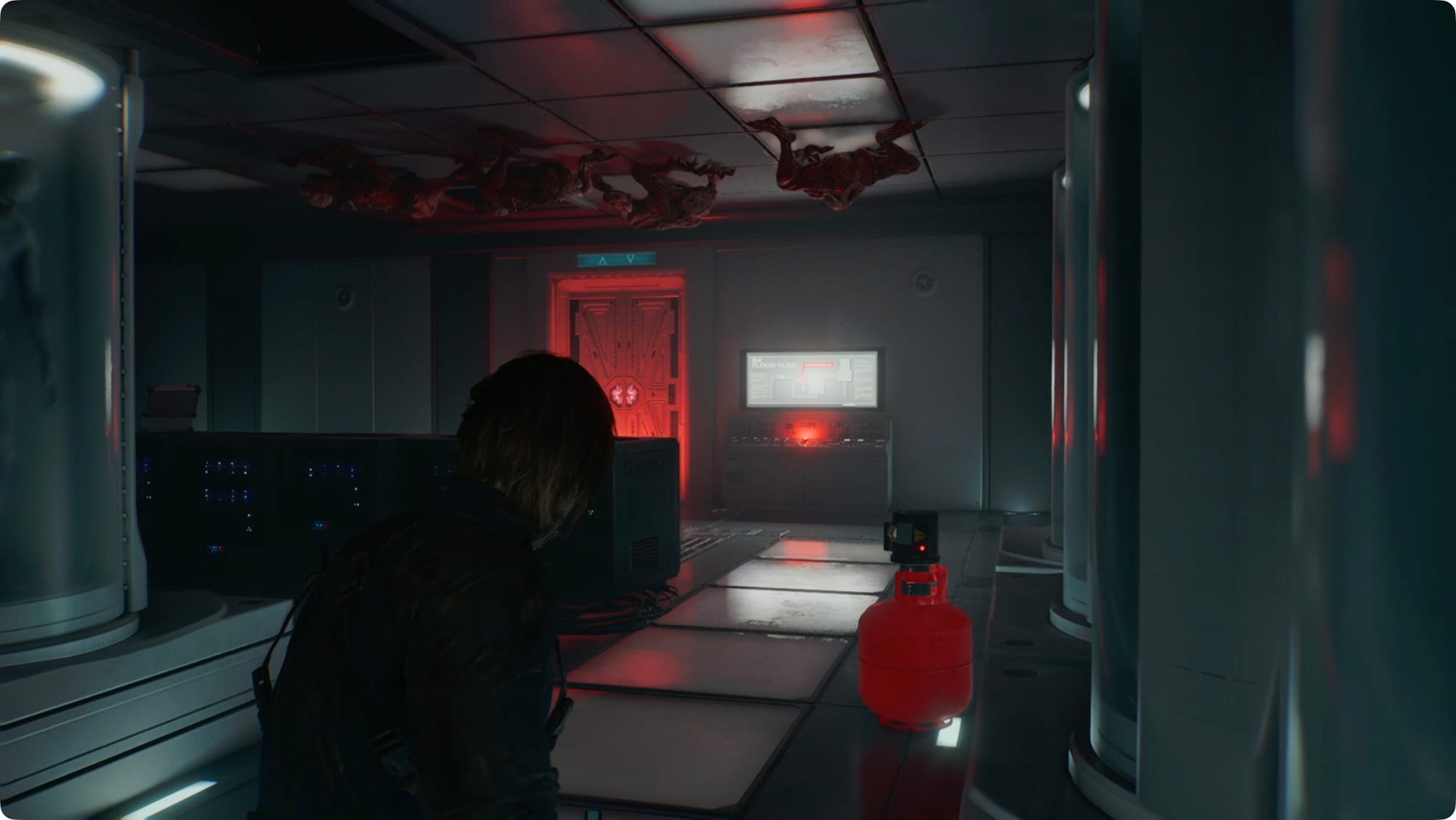 Schlagen Sie auf die leuchtende (?) Kiste in der Ecke, um etwas Maschinengewehrmunition zu erhalten, schnappen Sie sich den Med-Injektor in der südwestlichen Ecke und schauen Sie auf dem Monitor in der Wand nach dem N0-AH-Statusbericht.