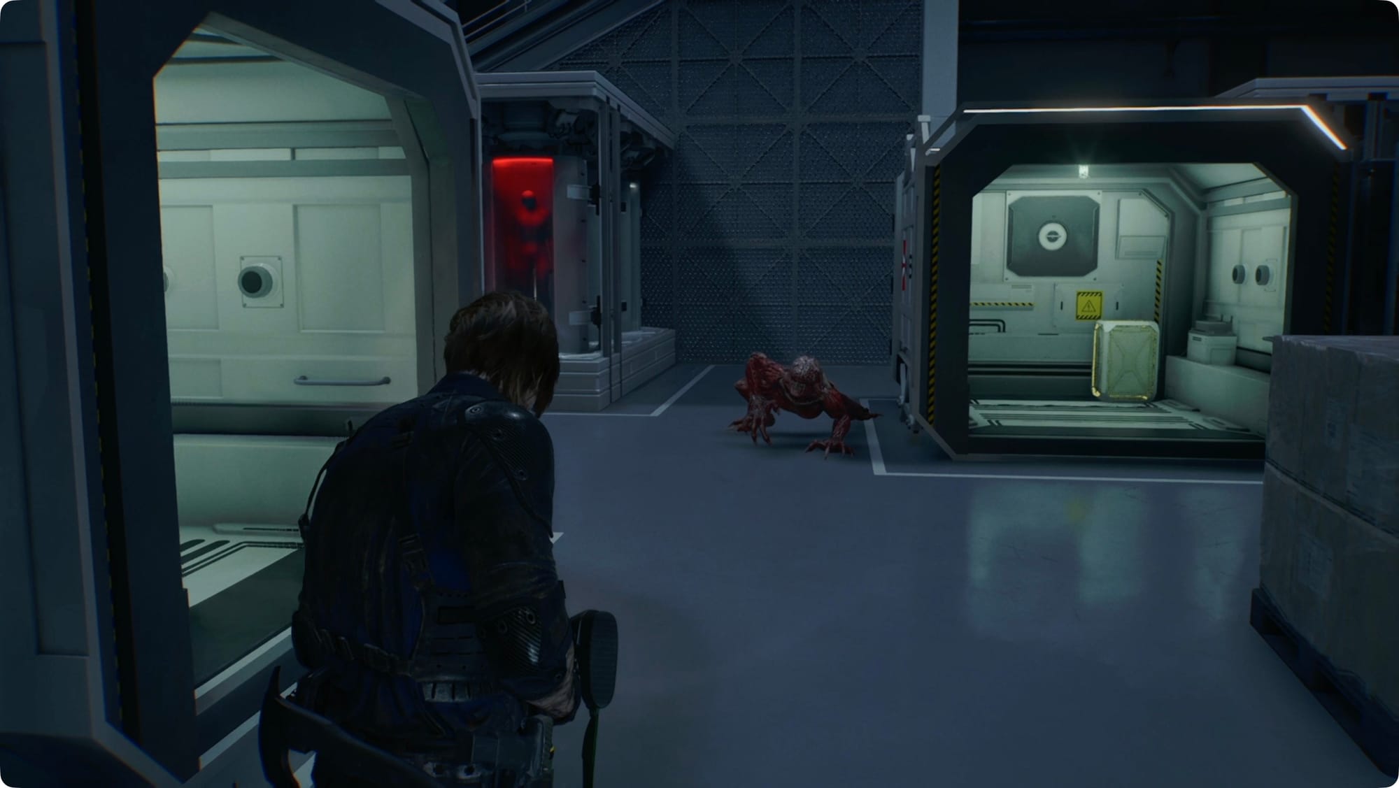 Zerschmettere die Kiste in der Mitte des Raums, um etwas Handfeuerwaffenmunition zu erhalten, und die Kiste neben der Tür, um einen Med-Injektor zu erhalten.