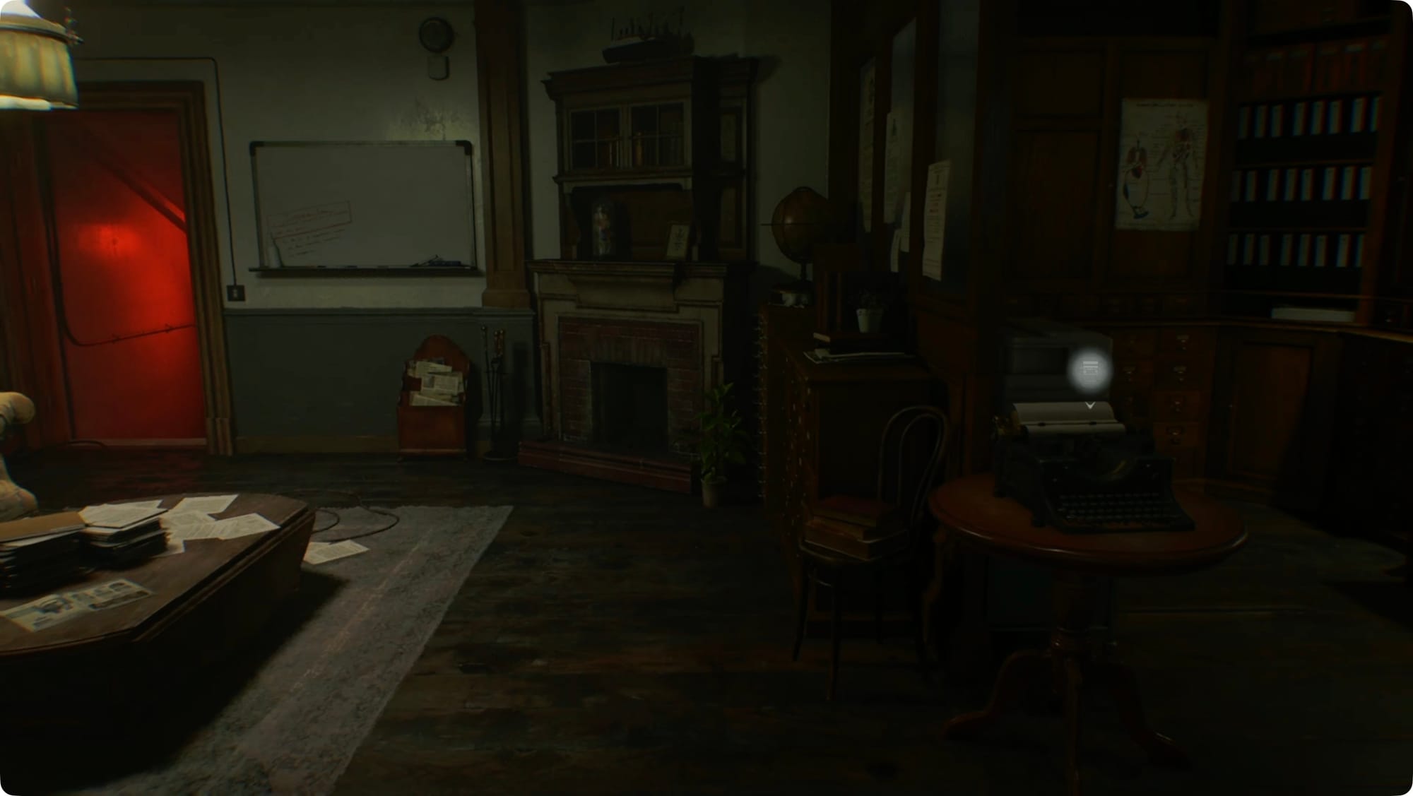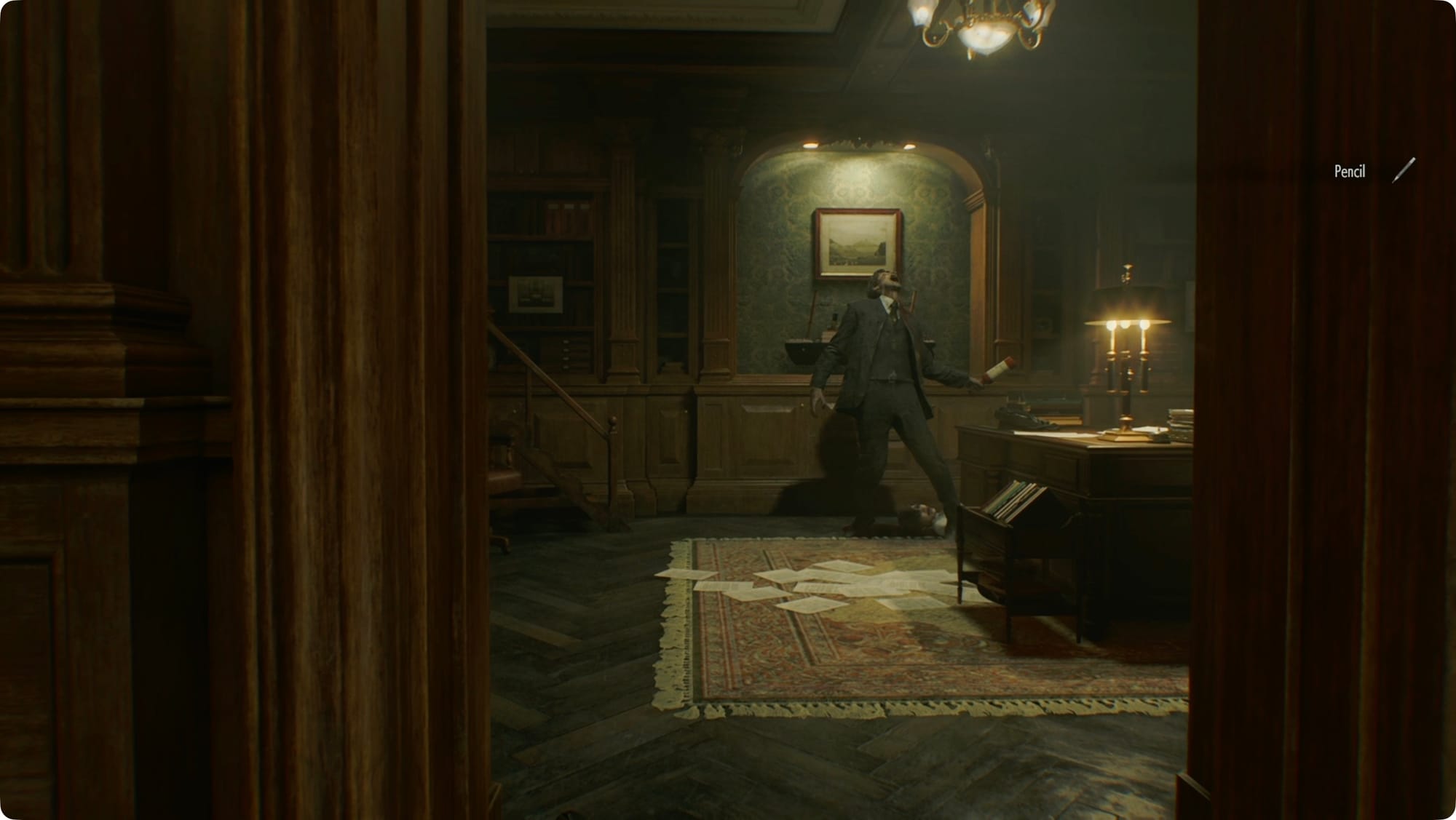 Er wird Sie bemerken, sobald Sie die Schwelle überschreiten. Verwenden Sie also einfach die verbleibende Munition und etwas Spitzes, um ihn zu töten. Nehmen Sie den Bleistift vom Schreibtisch, suchen Sie in der linken Schreibtischschublade nach Pistolenmunition und lesen Sie die Notiz an den Vorsitzenden in der Ecke.