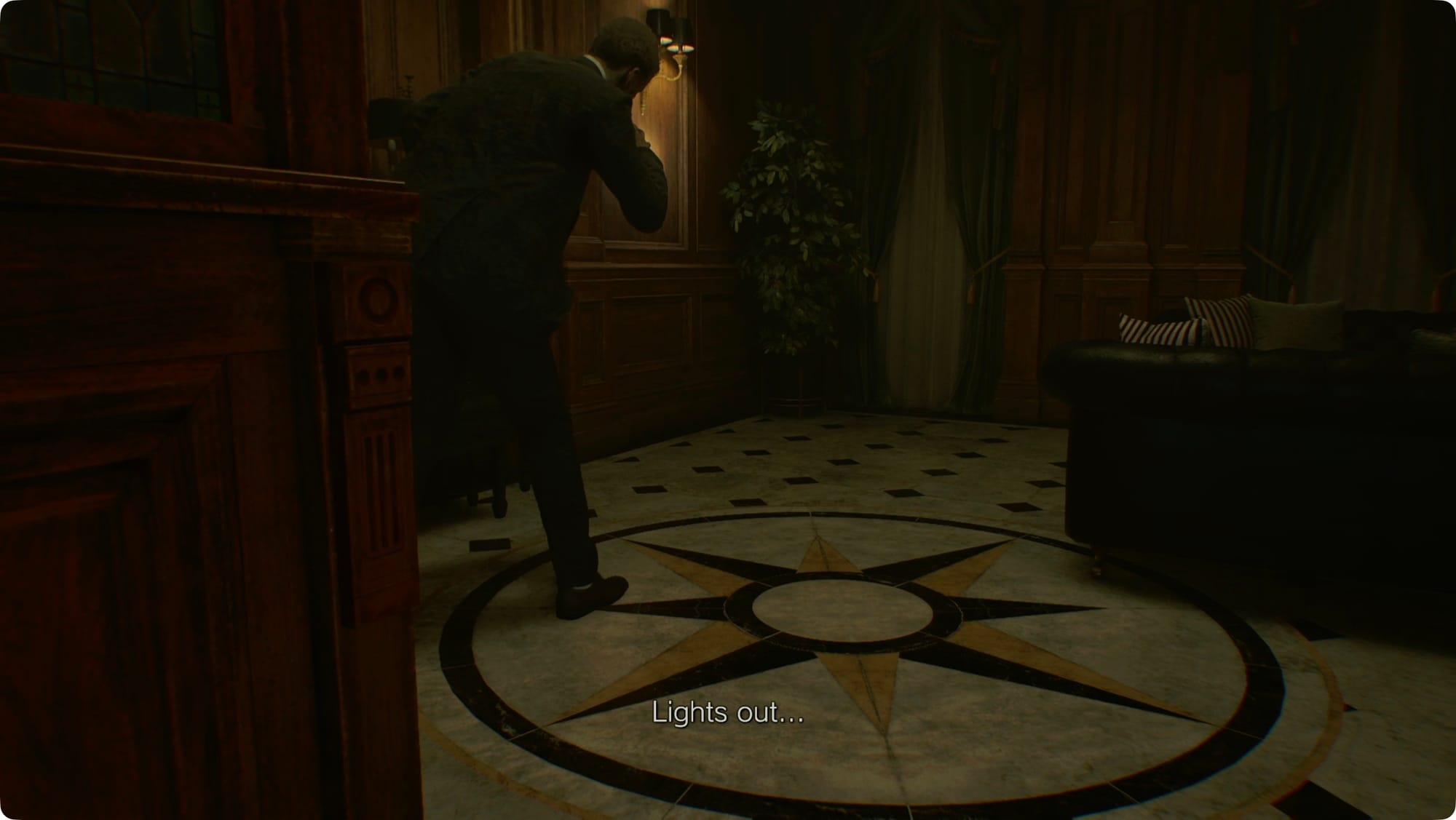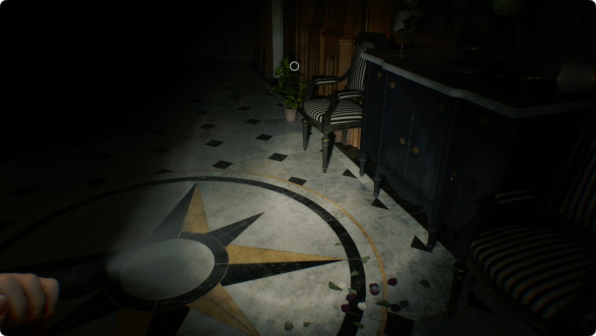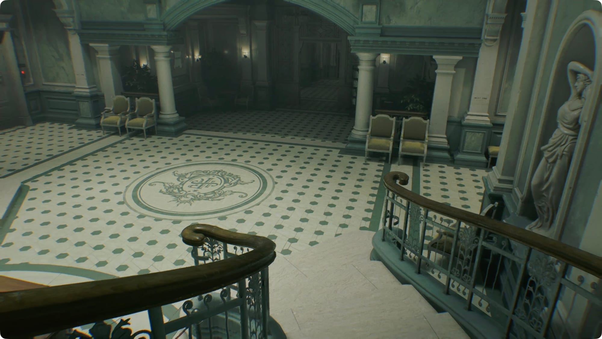 Nehmen Sie es den Flur entlang nach rechts (Osten). Unterwegs triffst du einen hilfsbereiten Gastfreundschaftszombie. Setzen Sie sie ab und gehen Sie dann zurück zur Zentralhalle. Platzieren Sie den Mondquarz in der Vordertür.
