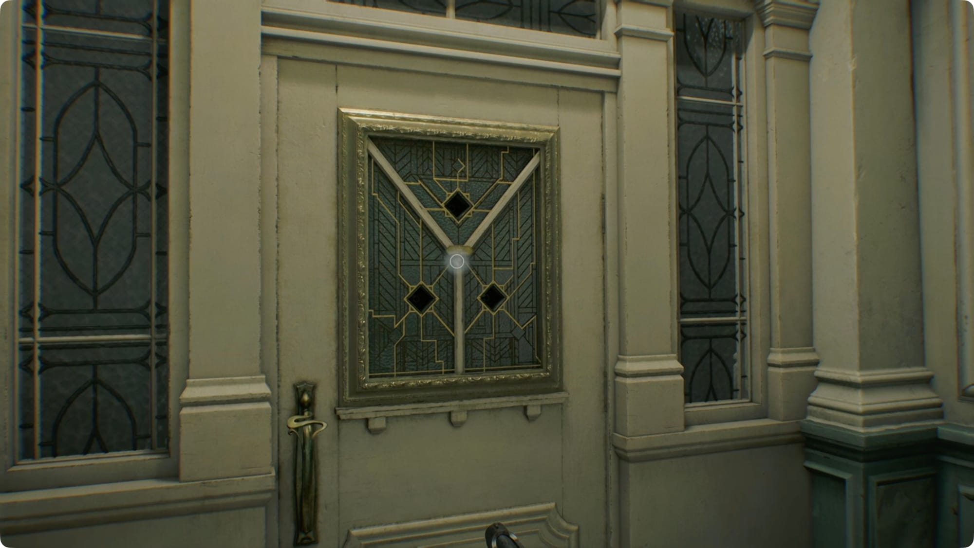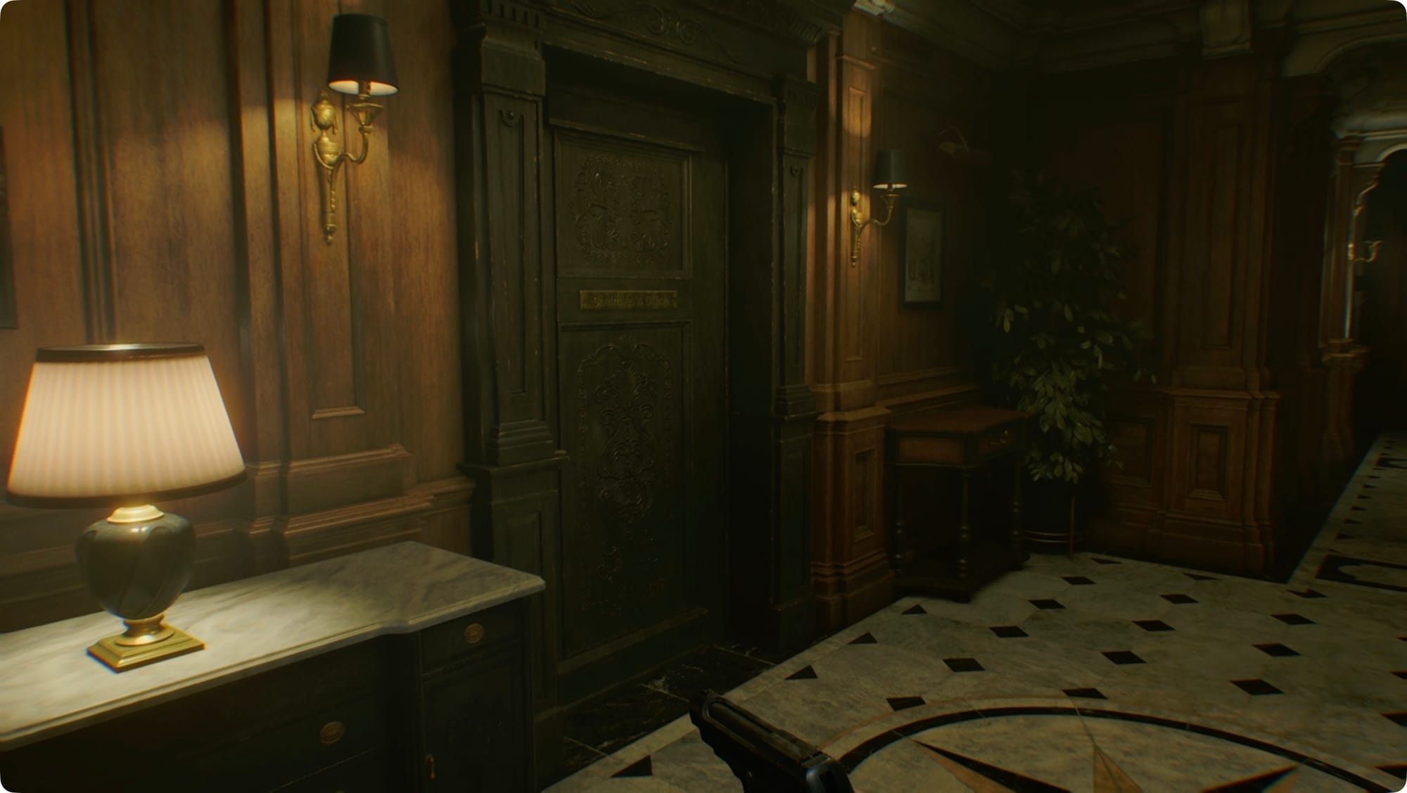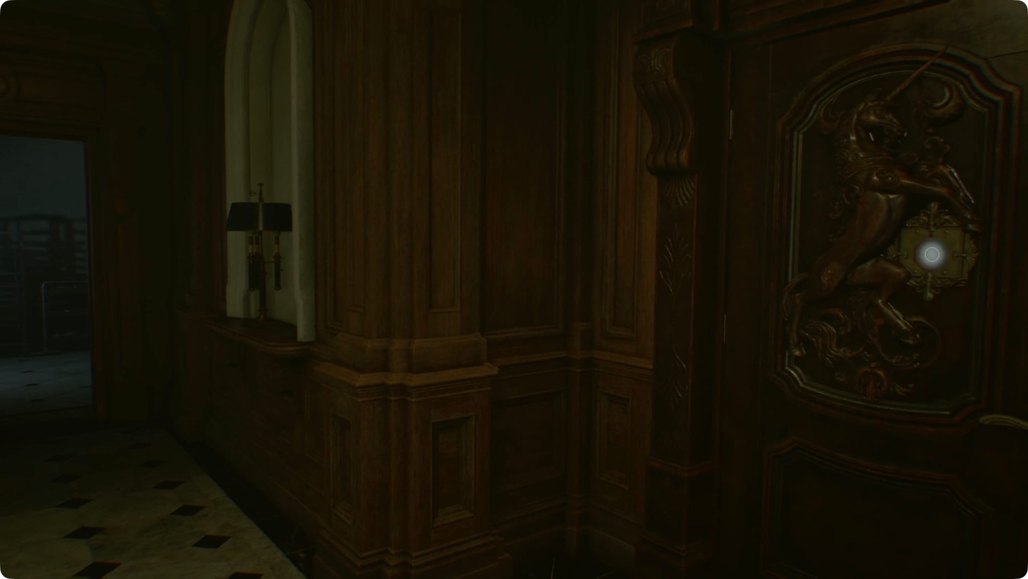 Gehen Sie zurück zur zentralen Halle und biegen Sie links zur Westflügeltür ab. Im nächsten Flur biegen Sie links ab. Sie kommen an einer weiteren Tür mit Einkerbungen vorbei, die ich Einhorntür nennen werde. Gehen Sie weiter daran vorbei.