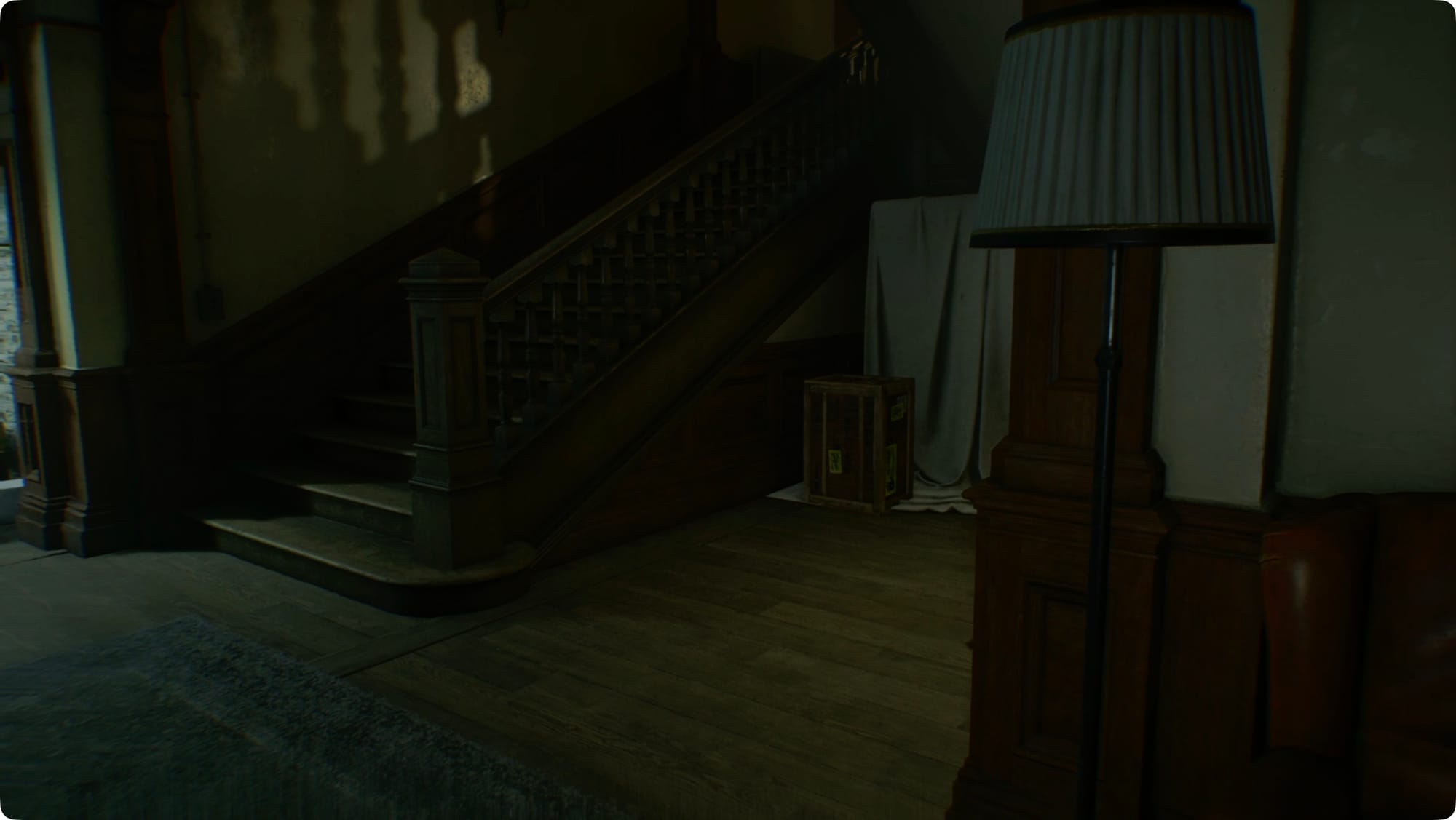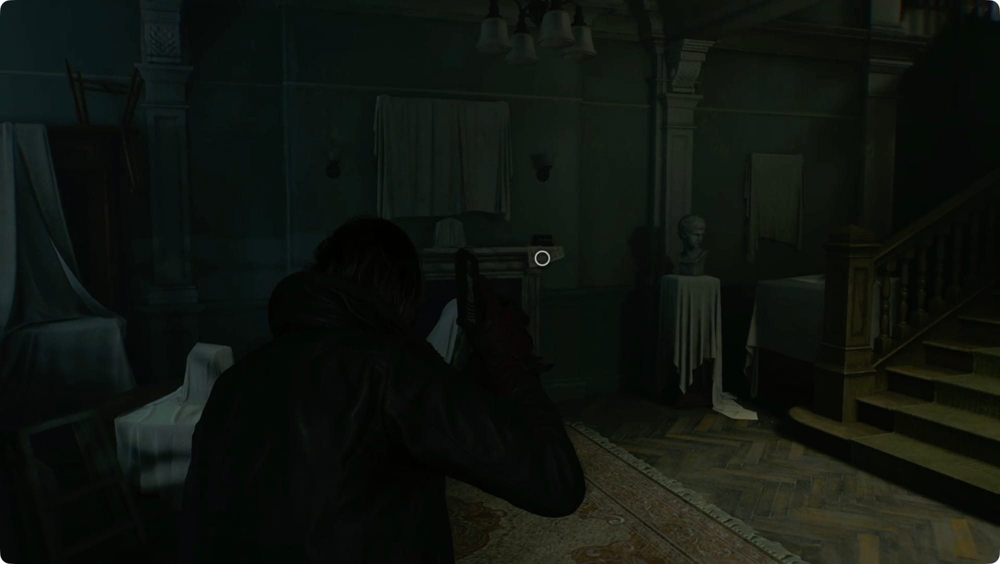 Wenn Sie durchkommen, sehen und hören Sie den ersten Mr. Raccoon. Schieße darauf oder zerschmettere es, um die Jagd zu starten. (Ich habe den Screenshot davon verpasst.) Gehe die Treppe hinauf.