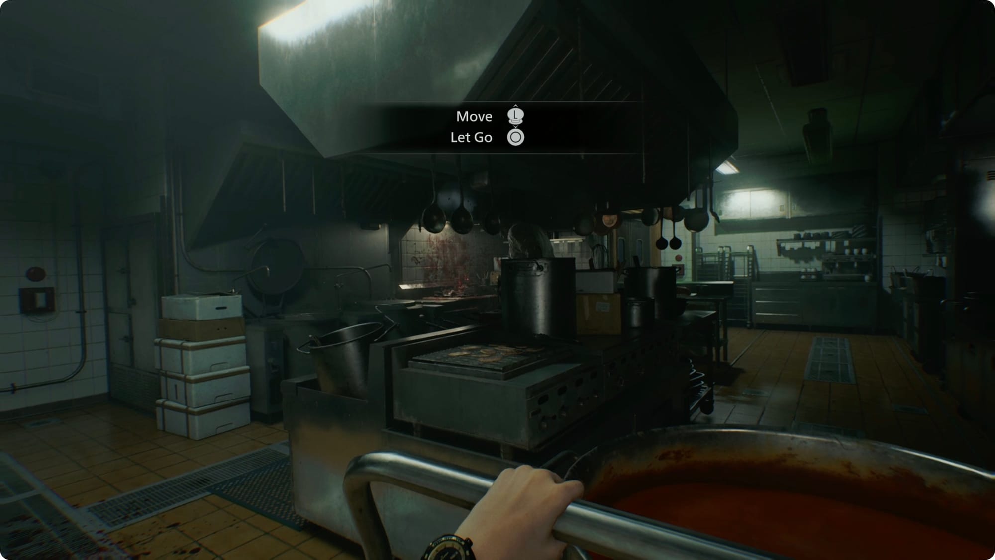 Machen Sie sich nicht die Mühe, den Metzger zu erschießen, das macht ihn nur wütend. Warten Sie stattdessen, bis er auf die andere Seite des Raums geht. Schleichen Sie sich nach links, machen Sie einen Bogen nach rechts und schnappen Sie sich den Wagen mit dem Abfalleimer. Während er hackt, fahren Sie mit dem Karren zurück. Wenn Sie ihn sagen hören: „Als nächstes kommt …“, verstecken Sie sich und warten Sie, bis er mit dem Schlachten fortfährt.