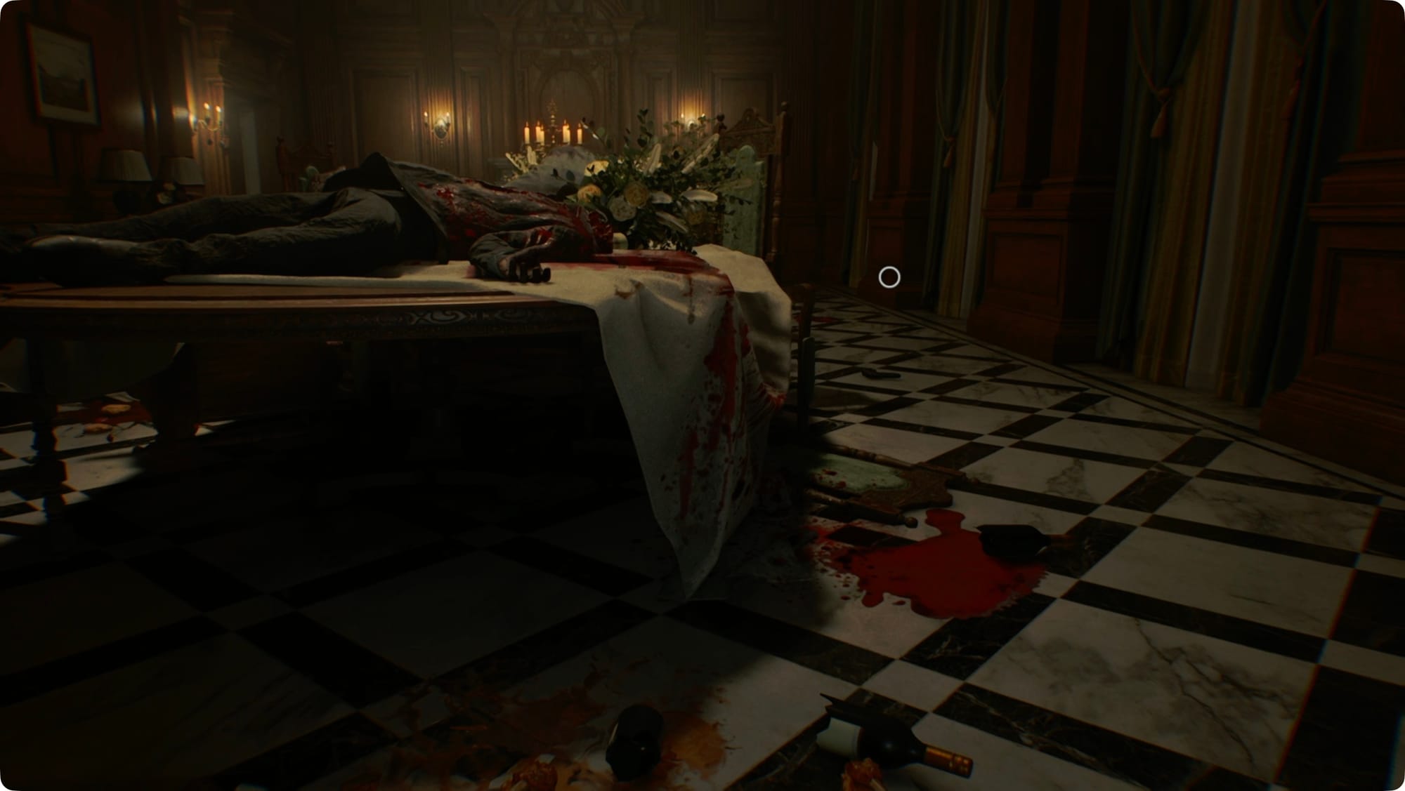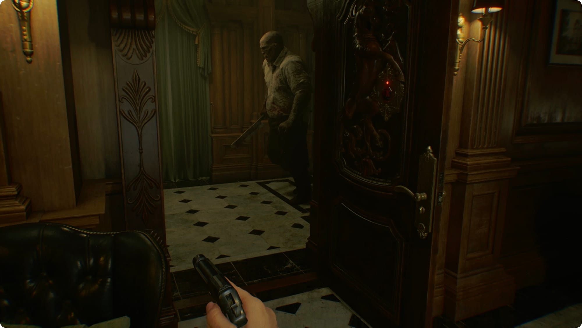 Laufen Sie zurück und speichern Sie (warum nicht) und gehen Sie dann erneut durch die Tür zum Westflügel. Benutzen Sie dieses Mal das rote Juwel an der Einhorntür zu Ihrer Rechten. Gehen Sie aber schnell hinein, denn Ihr Freund, der Metzger, patrouilliert in der Halle.