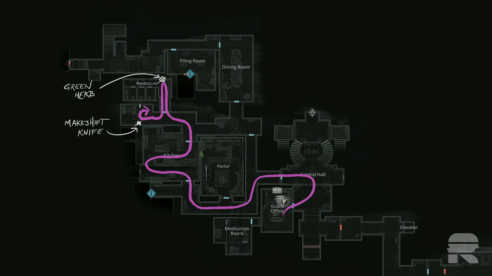 Die Türen zum Ost- und Westflügel sind verschlossen. Gehen Sie also weiter geradeaus (nach Süden). Noch ein paar Stufen weiter unten finden Sie links eine nutzlose Karte an der Wand und rechts eine Tür. Gehen Sie durch, um Ihren nächsten sicheren Raum zu finden.