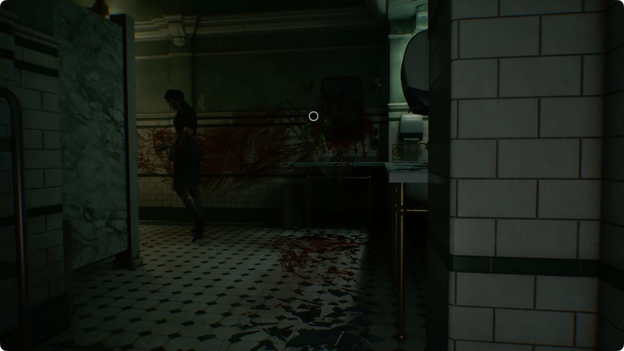 Biegen Sie in der nächsten Halle links ab. Die erste Tür rechts ist ein Badezimmer, in dem eine Zombie-Putzfrau eine Lady Macbeth-Aufführung macht. Warten Sie, bis sie aufhört, den Spiegel zu „putzen“, und schleichen Sie sich hinein. Während sie hinten im Raum beschäftigt ist, schleichen Sie sich hinein und schnappen Sie sich das Grüne Kraut direkt vor Ihnen. Das ist alles, was es zu schnappen gibt, also schleichen Sie sich wieder raus, bevor sie Sie sieht.