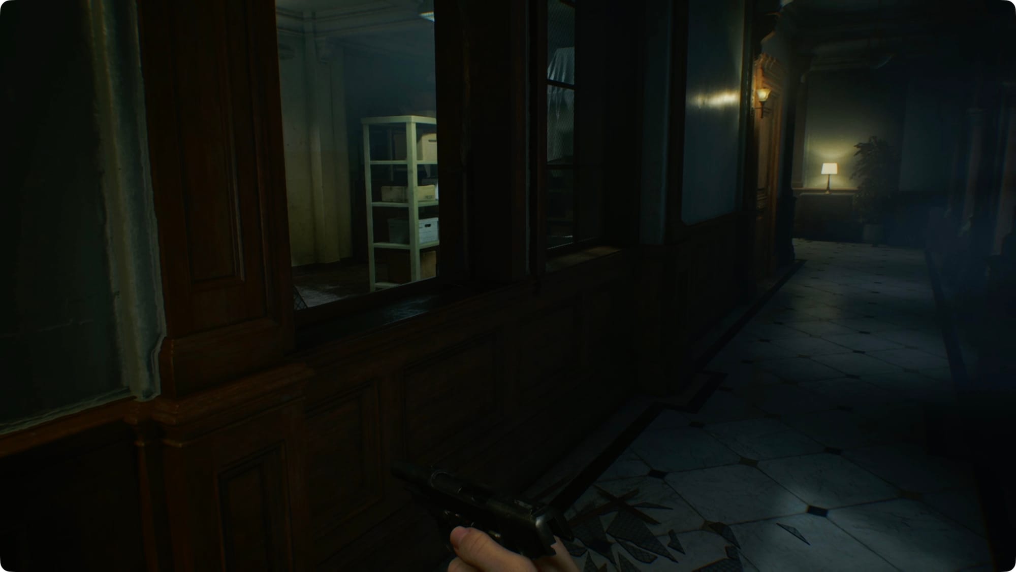 Am anderen Ende der Halle steht ein Zombie, der davon besessen ist, das Licht auszuschalten. So kommt man eigentlich um ihn herum. Rechts von der Stelle, an der Sie das Messer haben, befindet sich an der Wand ein Lichtschalter. Schalten Sie es ein und ducken Sie sich dann hinter die Trennwand zu Ihrer Linken. Warten Sie, bis der Zombie kommt, schalten Sie ihn aus und schleichen Sie sich dann an ihm vorbei.