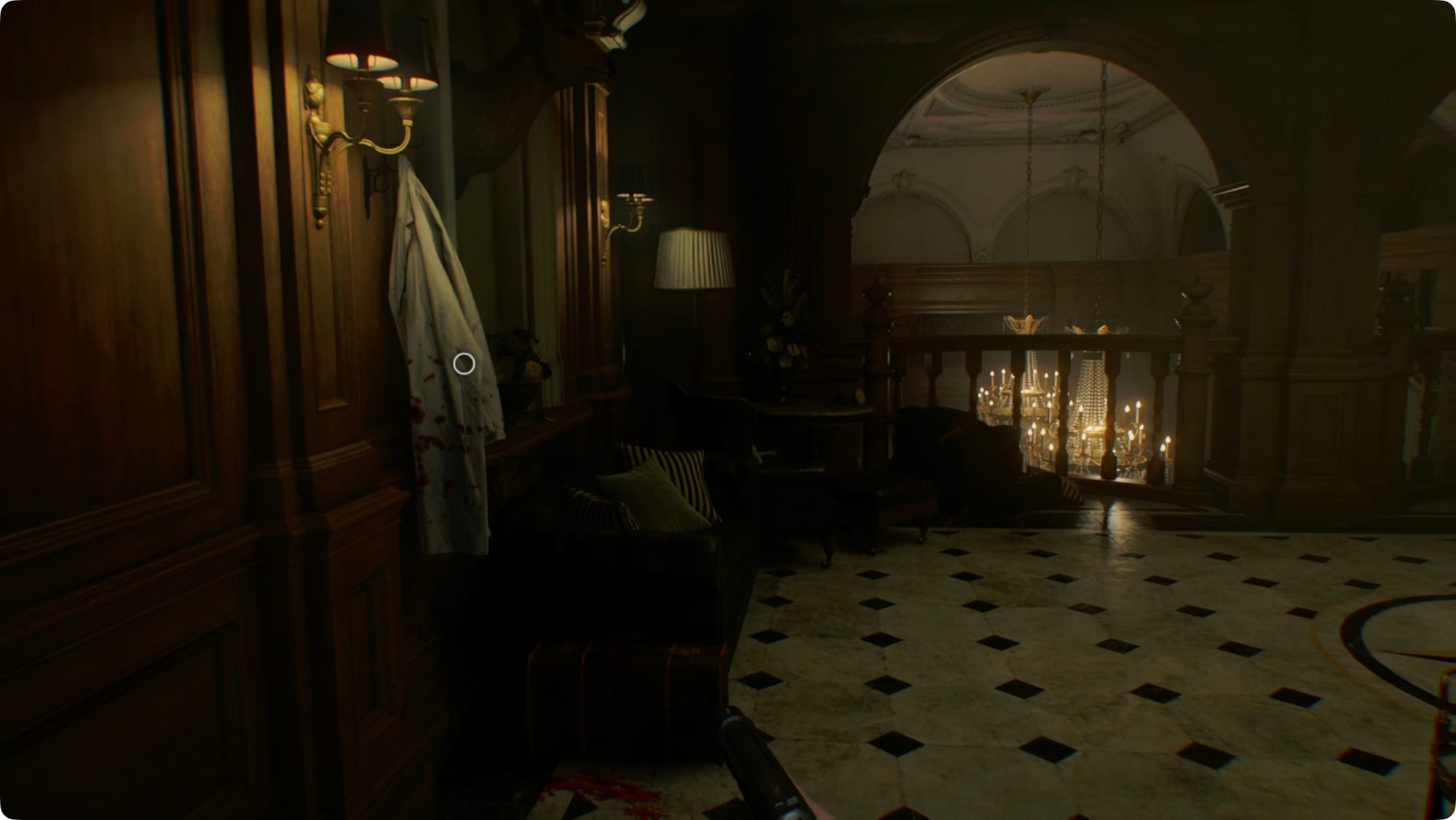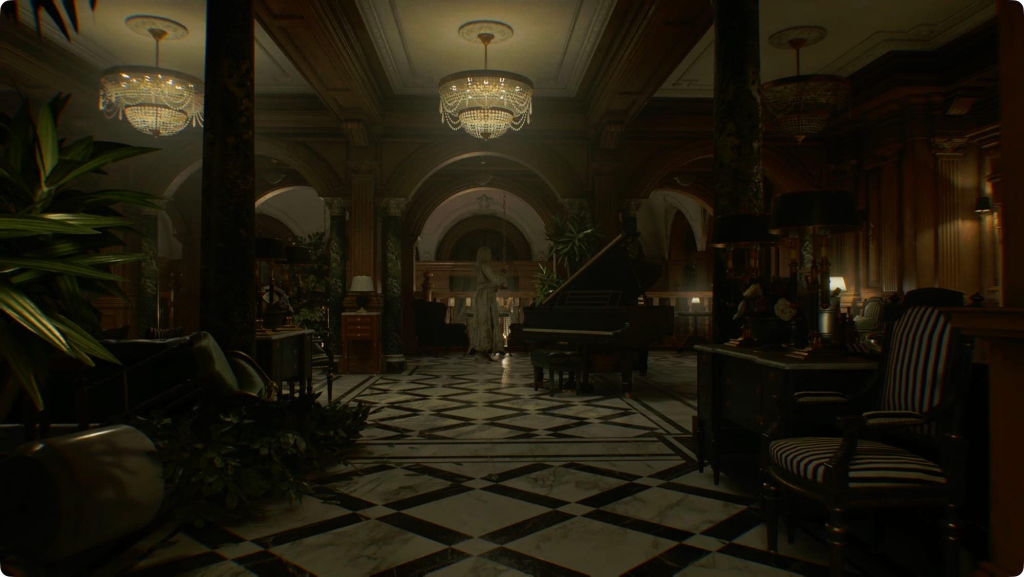 Es ist voller Zombie-Gäste, also bleiben Sie geduckt. Warten Sie in der Tür, bis der Zombiesänger in der Mitte des Raums erscheint, und gehen Sie dann nach links. Gehen Sie nach vorne, nehmen Sie die antike Münze vom Klavier und gehen Sie nach rechts, um eine Reihe von Türen zu finden.