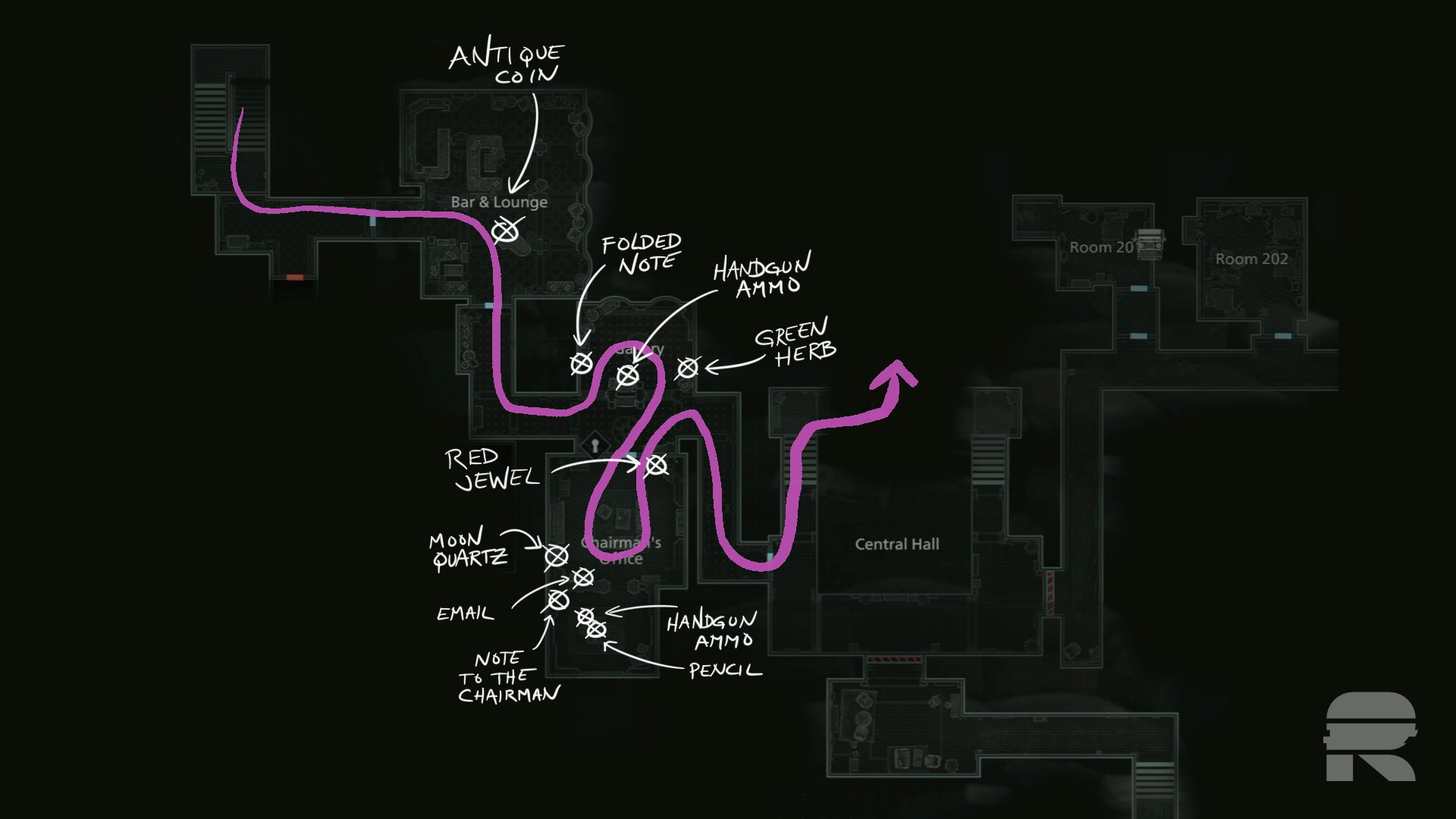 Sobald Sie 2F erreicht haben, nehmen Sie die Karte des Westflügels von der Wand. Biegen Sie links ab. Die Tür zu den Büros auf der rechten Seite ist verzogen. Gehen Sie also weiter geradeaus in Richtung Lounge.