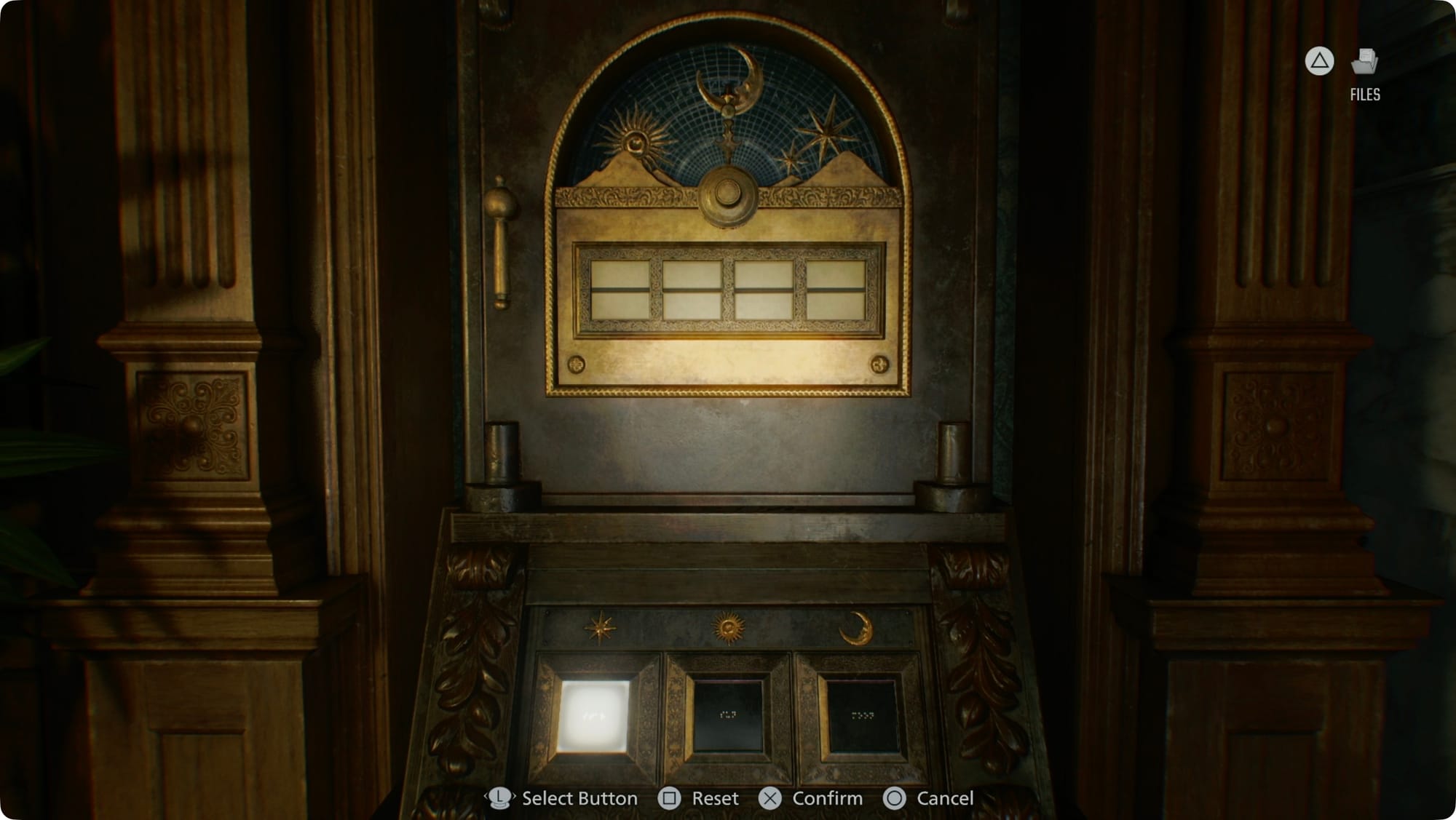 Gehen Sie die Treppe auf der rechten Seite hinunter. Überprüfen Sie die Haupttür – Tür mit Einkerbungen – auf einen Hinweis (Sonne, Mond, Stern) darauf, wonach Sie suchen. Die Tür oben auf der anderen Treppe ist verschlossen. Gehen Sie also weiter ins Erdgeschoss.