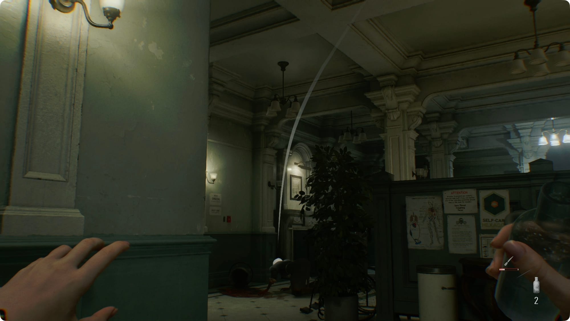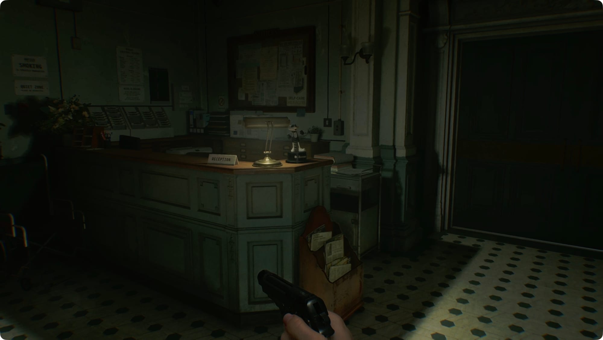 Nehmen Sie die Halle nach rechts (Süden). Im nächsten Raum befindet sich links ein verschlossenes Sicherheitstor, vor Ihnen ein Flur und rechts ein Wartebereich. Gehen Sie in Richtung Flur, bis Sie eine Zombiein sehen, die ihren Kopf um die Ecke steckt. Wenn Sie sie sehen, ducken Sie sich hinter den Blumenkasten auf der rechten Seite des Raumes.