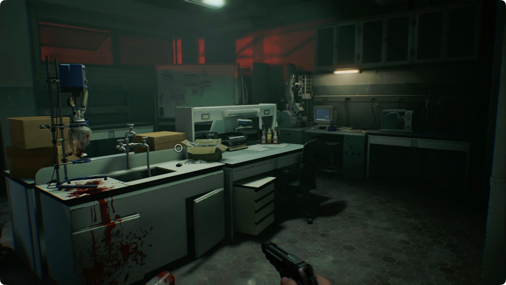 Biegen Sie rechts ab. Nicht weit entfernt gibt es eine Kreuzung mit einem weiteren Zombie, der das Licht ausschaltet. Ignoriere ihn vorerst. Gehen Sie weiter nach Osten bis zum Ende der Halle, um das Blutlabor zu finden (Spaß!).