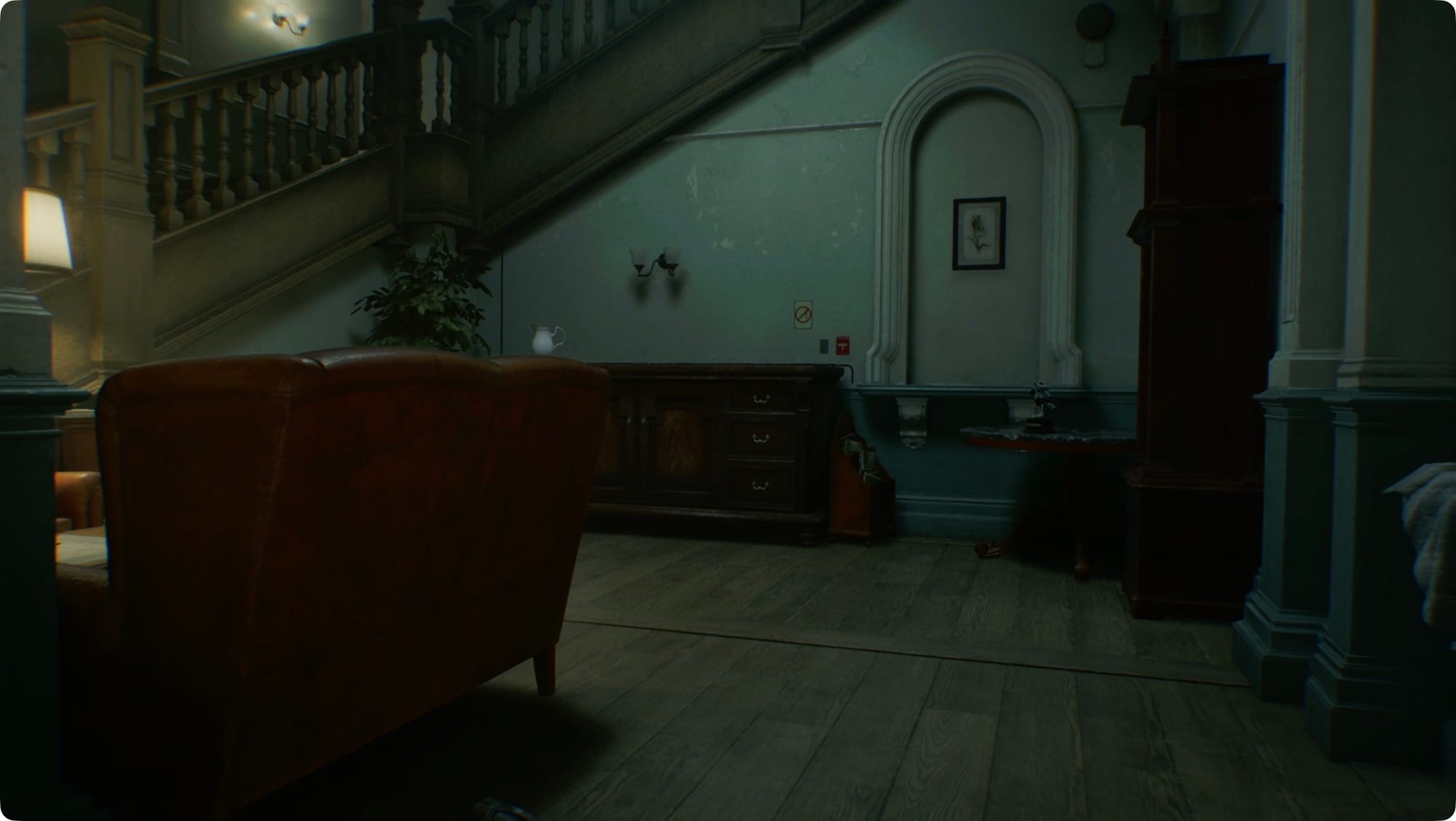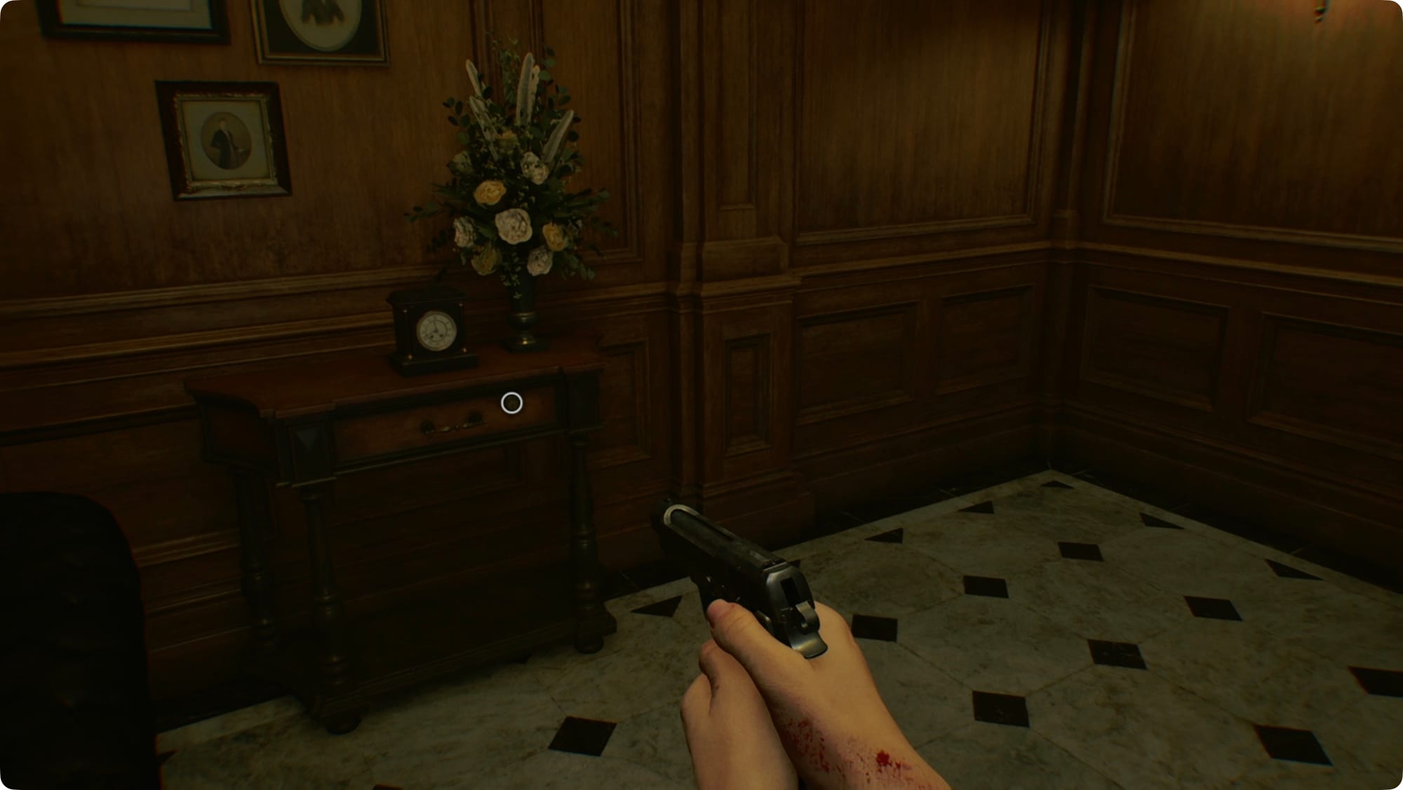 Sobald Sie den Ostflügel betreten, steht vor Ihnen ein Mr. Raccoon auf dem Schreibtisch. Auf der rechten Seite befindet sich eine verschlossene Schublade und vor Ihnen eine verschlossene Tür. Biegen Sie links ab.