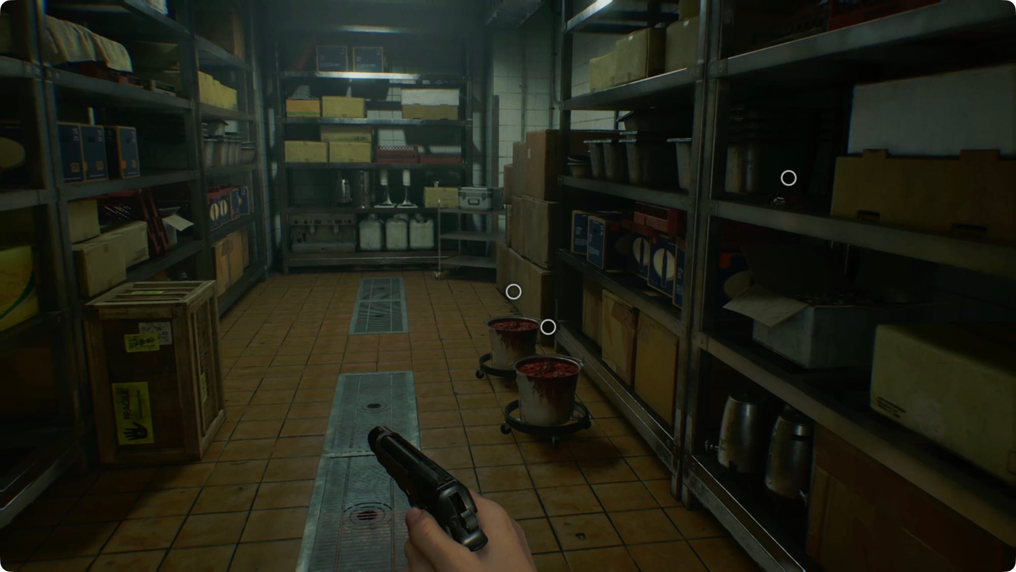 Gehen Sie weiter in die Küche und schließen Sie die Speisekammer auf. Schnappen Sie sich den Schrott und sammeln Sie beide Eimer mit Blut, um einen weiteren hämolytischen Injektor herzustellen. Zerschmettere die Kiste, um etwas Handfeuerwaffenmunition zu erhalten. Öffnen Sie die Kiste auf der Rückseite für eine 12,7 x 55 m große Patrone für Requiem (und laden Sie sie neu, um den Inventarplatz freizugeben). Dort gibt es auch einen Stakeout Takeout Charm.