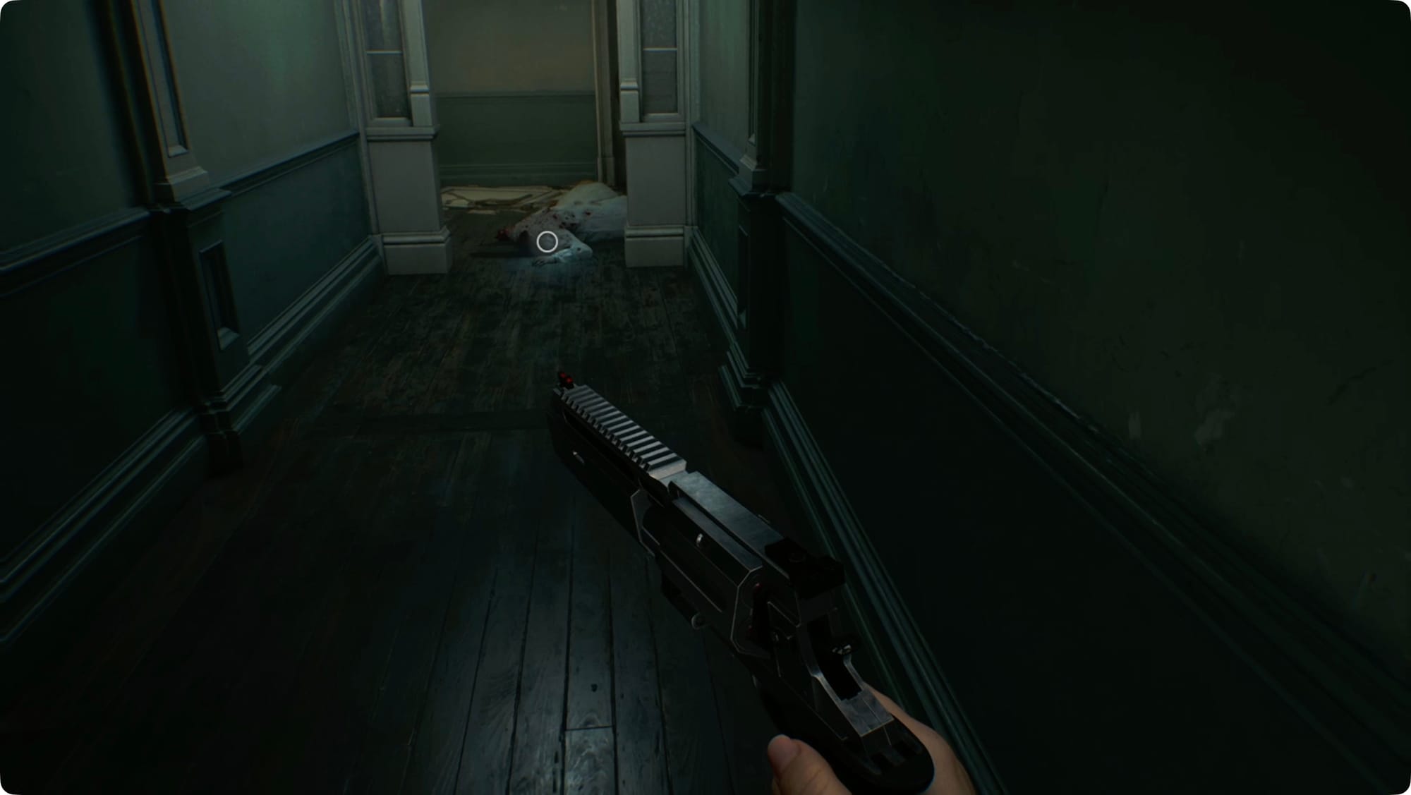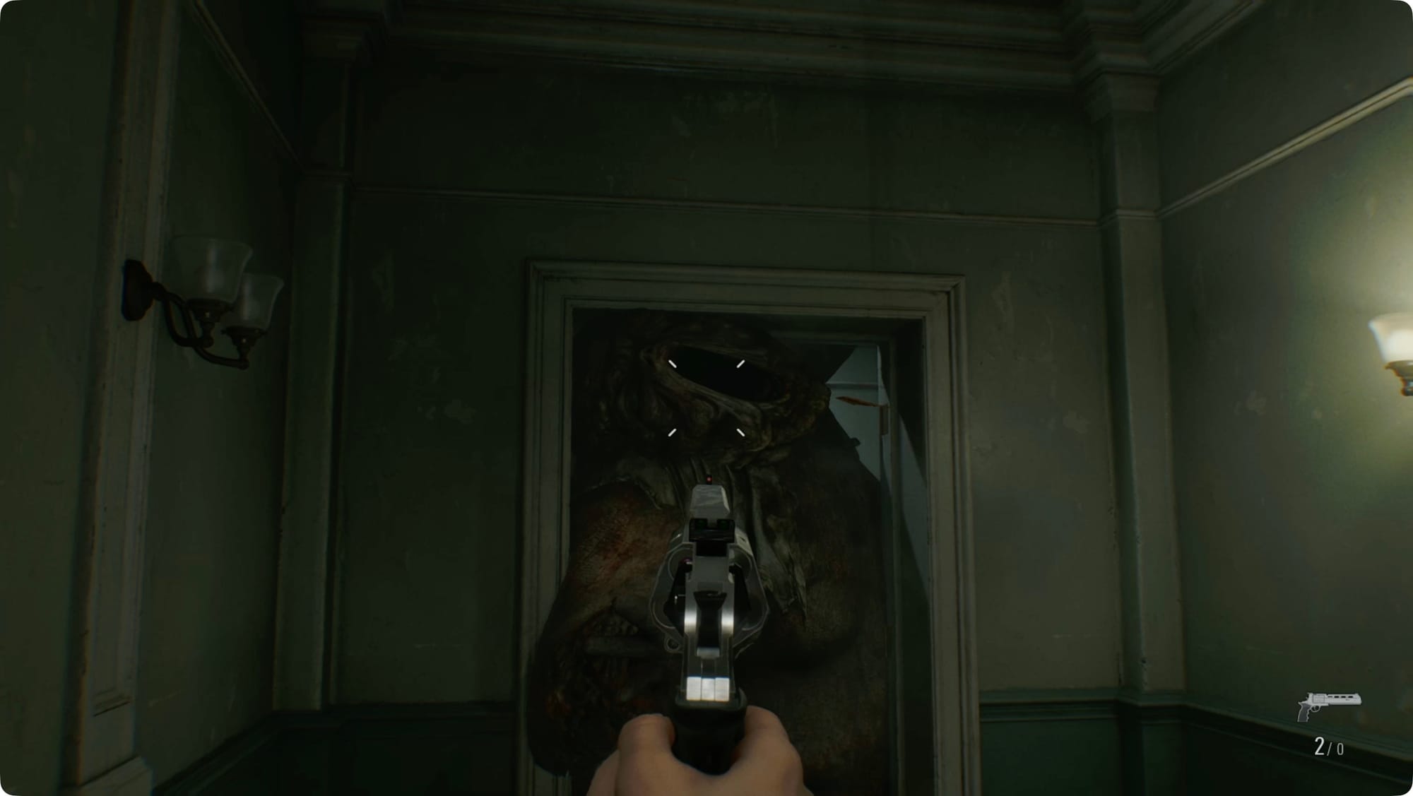 Gehe wieder zurück in den Flur. Gehen Sie noch einmal an der Kreuzung vorbei, aber betätigen Sie dieses Mal den Lichtschalter und laufen Sie dann den Weg zurück, den Sie gekommen sind. Der Licht-aus-Zombie wird kommen, ihn ausschalten und du kannst an ihm vorbeischleichen, ohne Munition zu verschwenden.